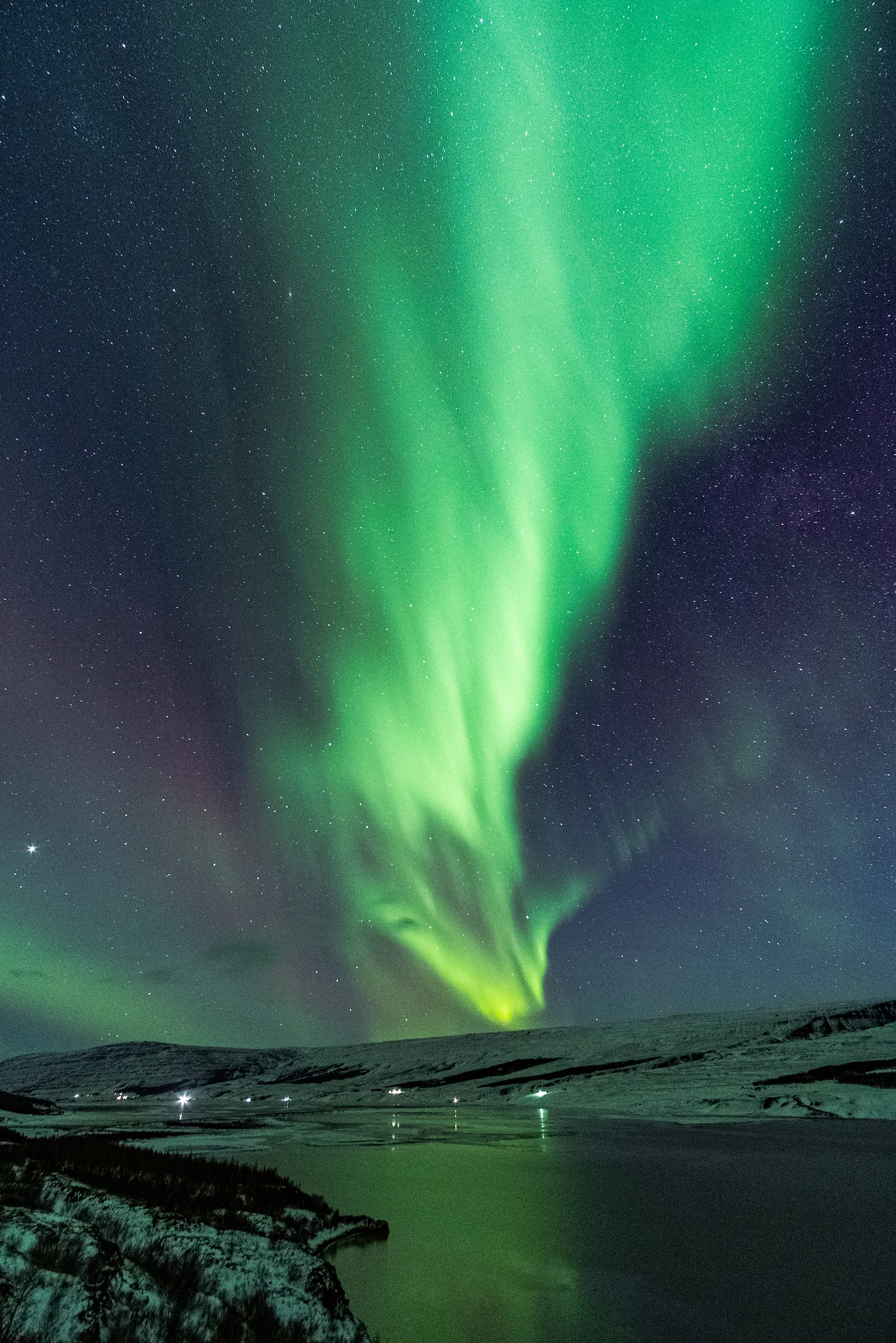 자동차와 함께 사진을 한창 만끽하다가 다시 강가 쪽으로 눈길을 돌리니 오로라가 한층 더 격렬한 소용돌이를 만들고 있었다. 다시 빠르게 삼각대를 돌려 가드레일 쪽으로 바짝 붙였다. 소용돌이치던 오로라는 이전보다 훨씬 더 넓은 부채꼴을 그리며 넓게 퍼져나가고 있었다.