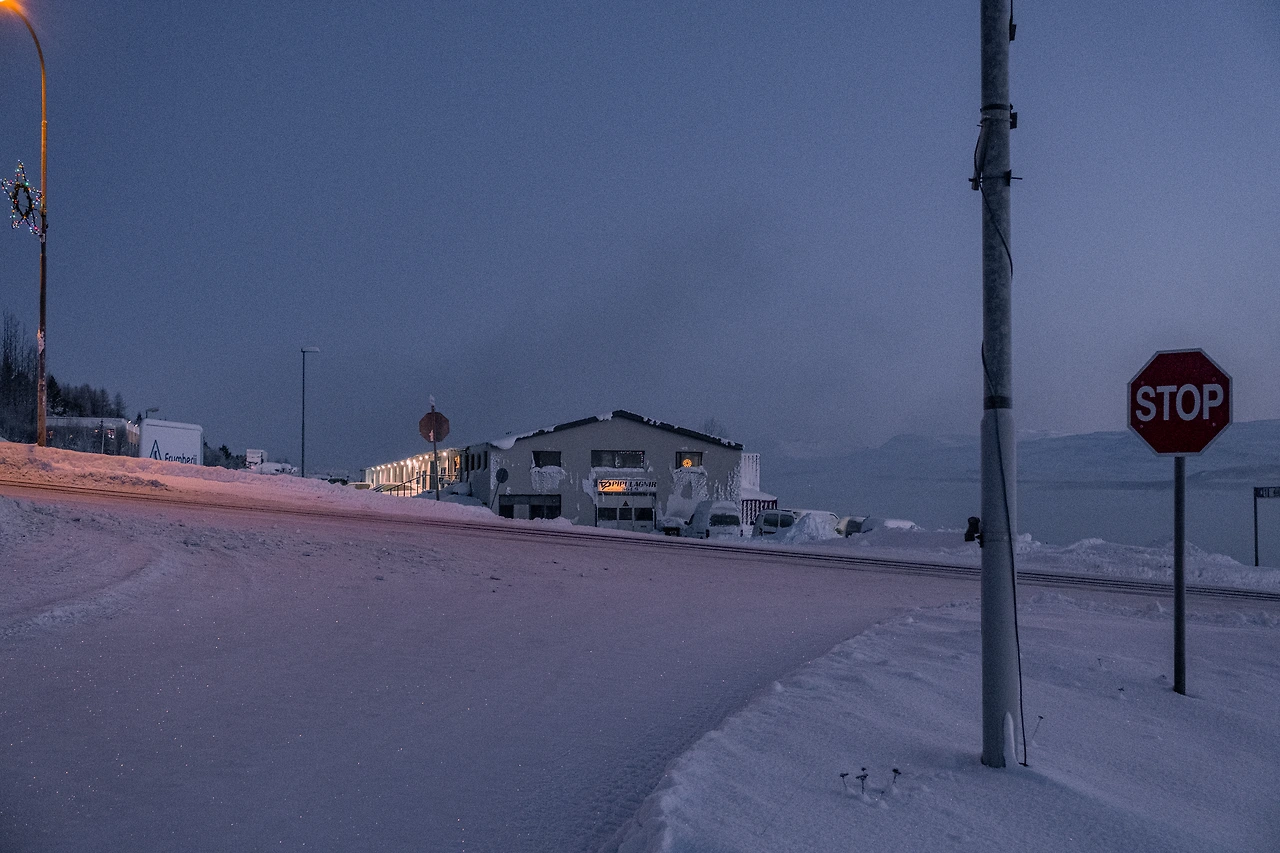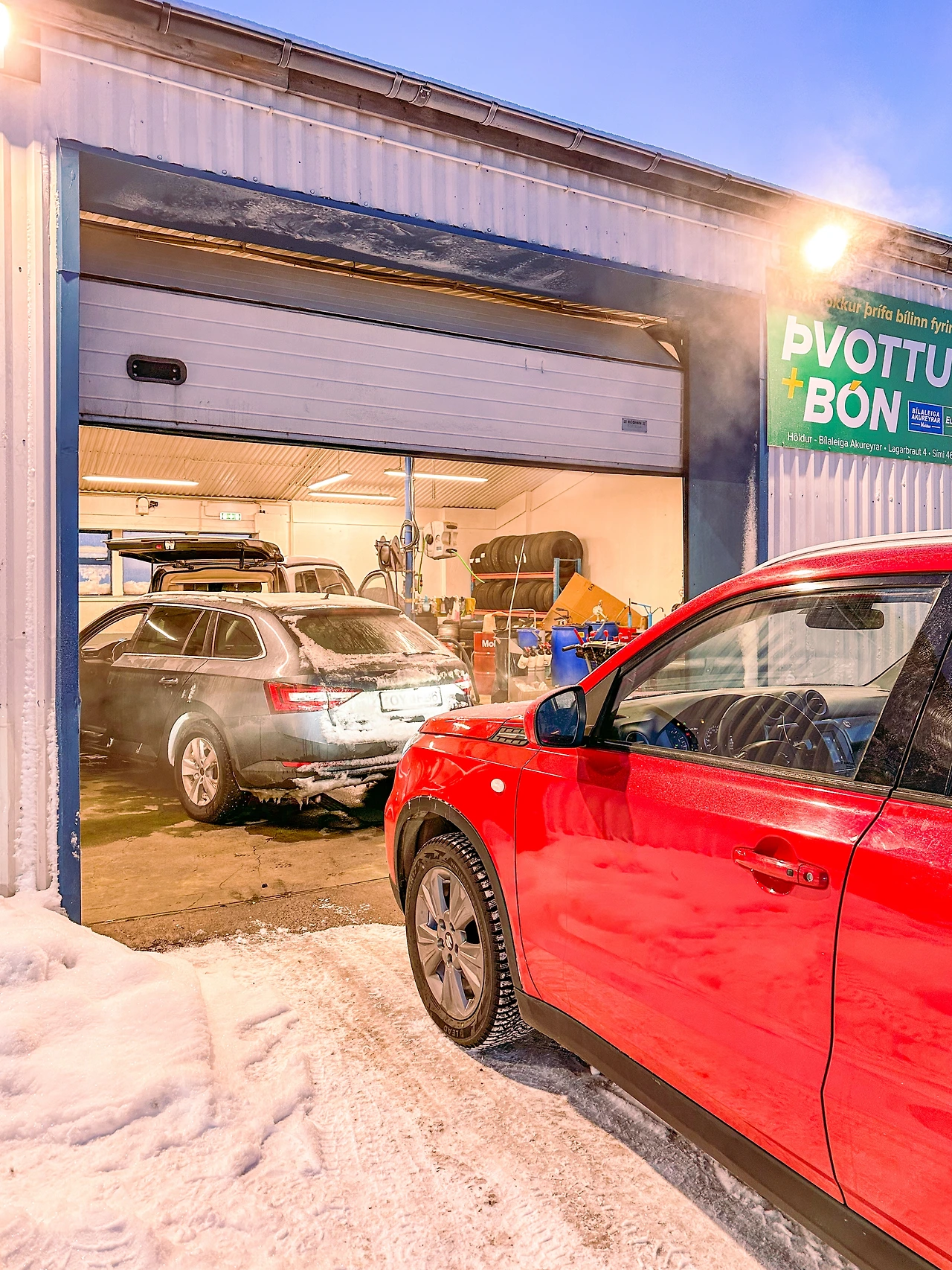 2022년 12월 24일 이른 아침, 에이일스타디르 1번 국도 진입 전, 자동차 수리점