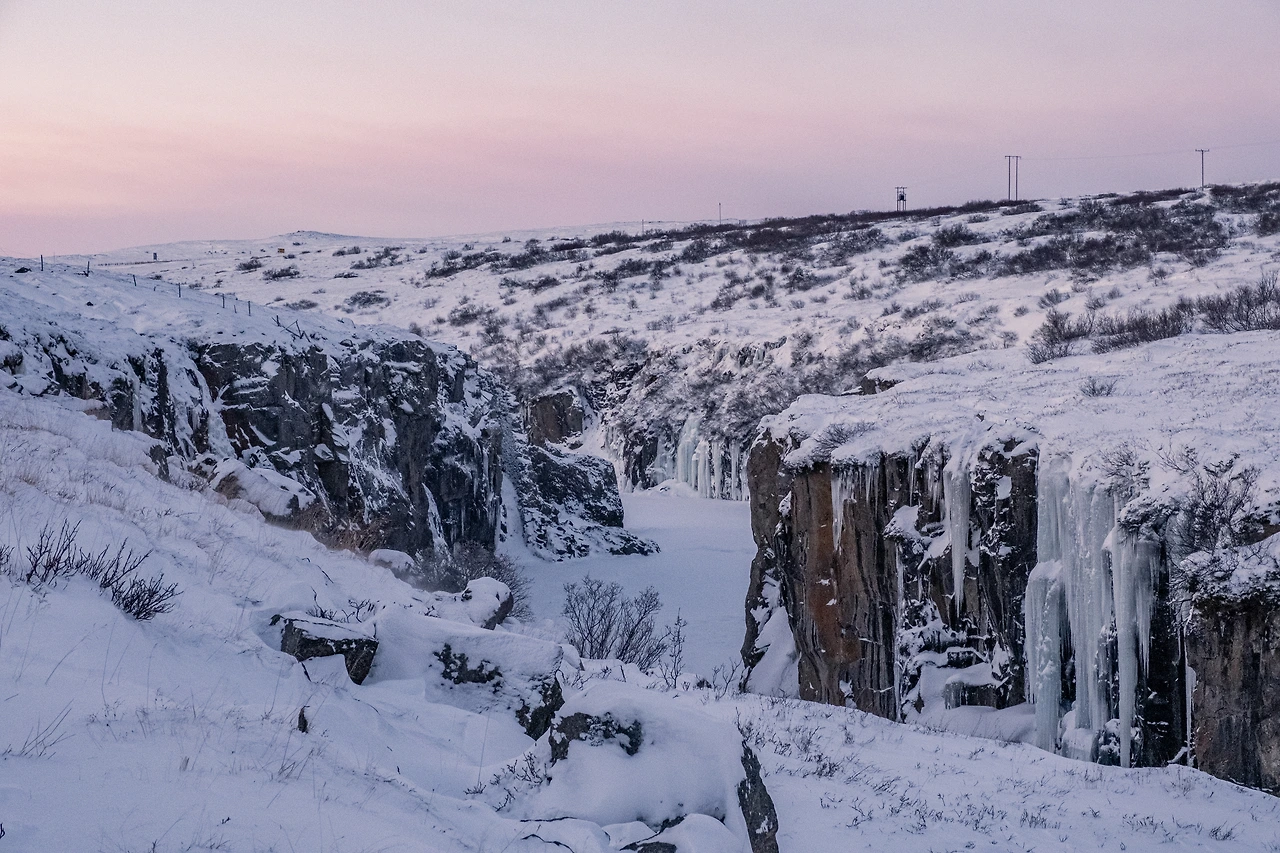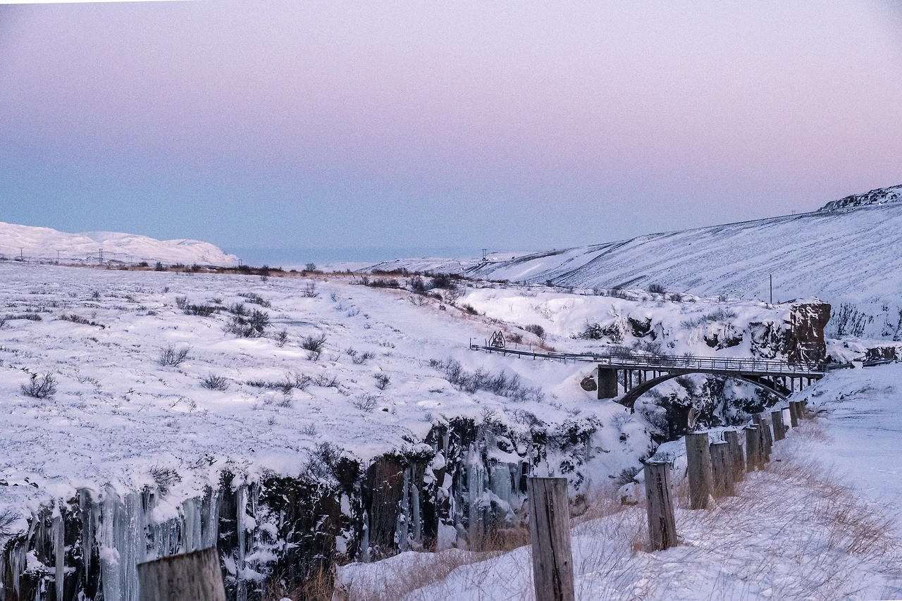 추위에 압도당한 것은 나뿐만이 아니었다. 협곡의 양옆 절벽으로는 거대하면서도 날카롭게 벼려진 고드름들이 잔뜩 달려 있었고, 흐르는 강물의 모습은 온데간데없이 흰 눈만이 강이 흐르는 길 위에 가득 덮여있었다. 다리까지의 실제거리는 아마 700미터 정도밖에 되지 않았겠지만, 한 걸음 한 걸음을 옮기는 것이 이미 천근만근이었다. 겨울이 압도해 버린 협곡은 그 모습대로 아름다웠다고 할만했지만 그 아름다움을 10분도 제대로 만끽하기가 어려웠다. 그럼에도 놓칠 수는 없었던 그 비경을 재빠르게 수십 장 가량의 사진으로 기록한 채 (그 와중에도 사진에 핀이 나갔는지에 대한 체크는 했다는 게 나 스스로도 어이가 없어 웃음이 나왔다.), 슬슬 시리다 못해 감각이 없어지고 있던 발을 재빠르게 움직여 차로 돌아갔다.