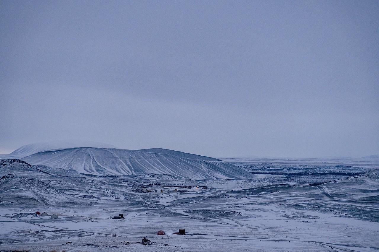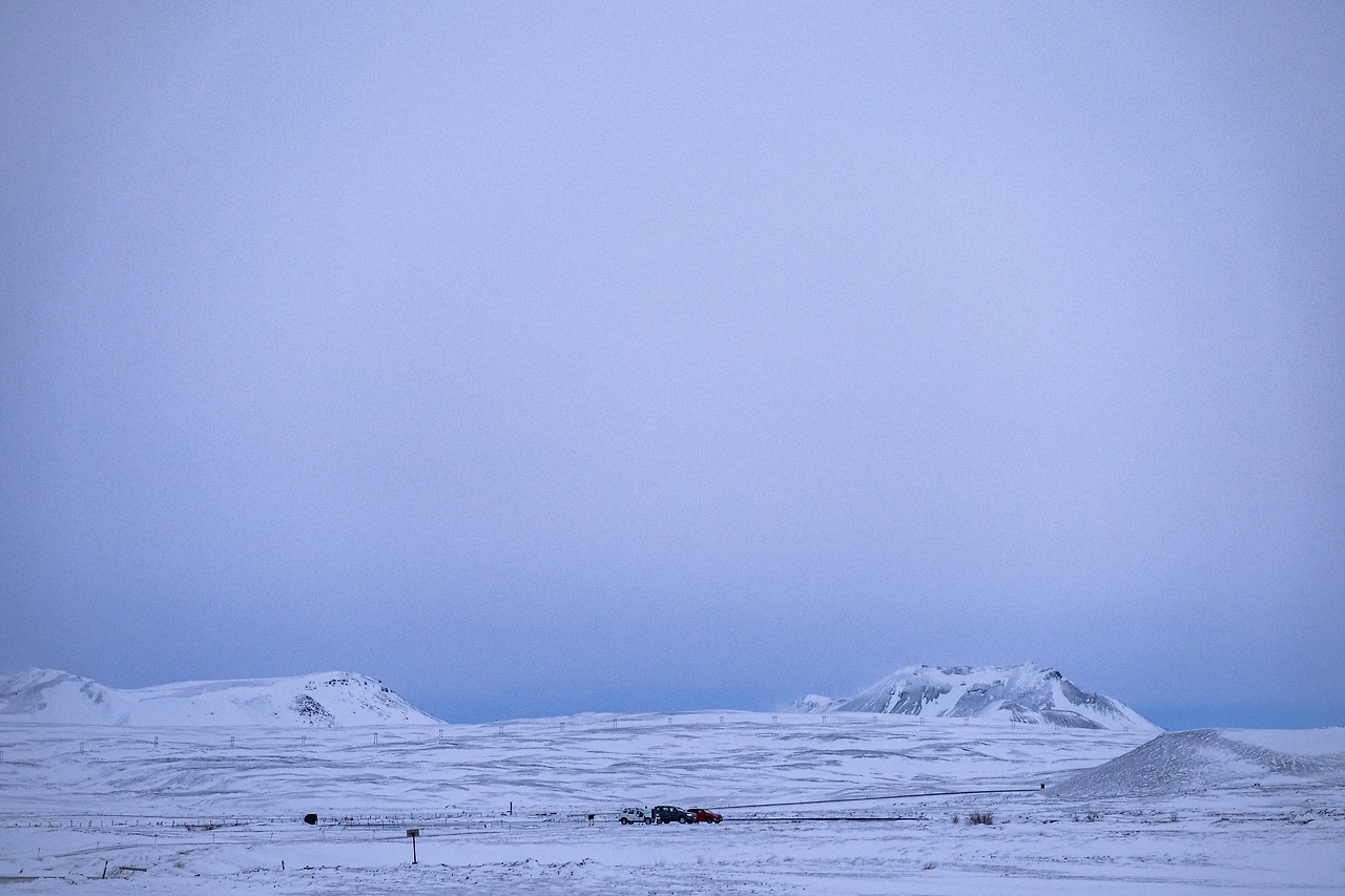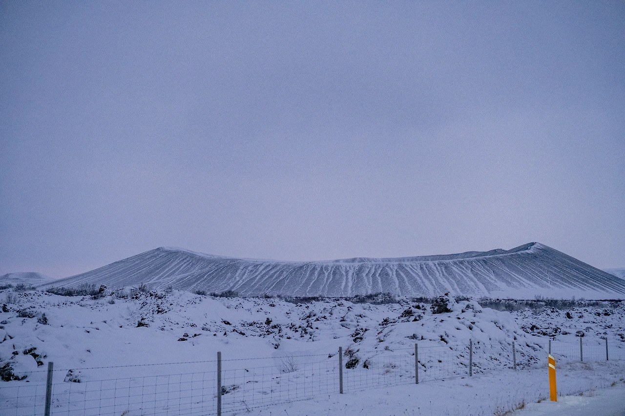 문득 찬 공기를 마시기 위해 운전석의 창문을 내릴 때쯤 진한 유황 냄새가 공기에 실려 날아오고 있다는 것을 느꼈다. '오호라, 이건 분명 미바튼 호수로 들어가는 길목 직전에 있는 크라플라 화산이 가까워 오고 있는 것일 거야'라고 혼자 중얼거리며 나는 달리고 있는 길 주변을 두리번거리기 시작했다. 과연 어느 순간부터 달리고 있던 1번 국도의 양옆으로는 폭설이 채 다 뒤덮지 못한 채 거뭇거뭇하게 튀어나와 있는 화산석들이 보이기 시작했다. 겨울의 혹한과 폭설이 차마 다 덮어버릴 수 없었던 이 불과 얼음의 나라에서 불을 맡고 있는 북부의 심장부에 도달하고 있었다. 떨리는 마음으로 갓길에서 잠시 지금까지 달려온 길을 기록한 후, 한 번의 정차 없이 곧바로 크라플라 화산 맞은편 아래에 위치한 흐베리르로 내달렸다.