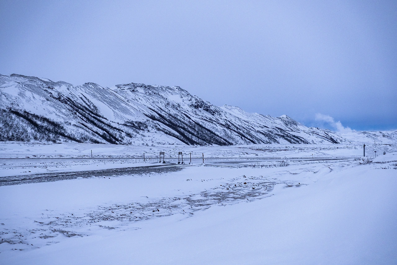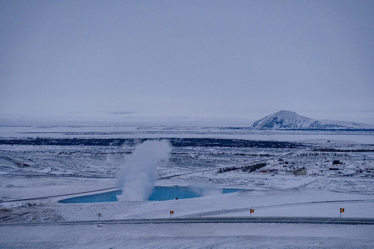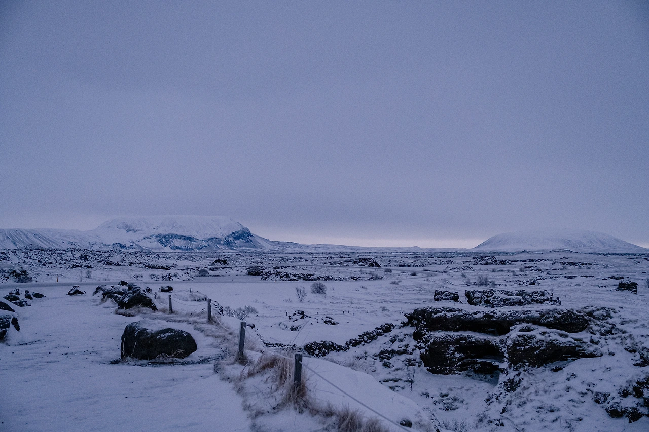 간헐천의 유황 냄새에 슬슬 후각이 마비되어 간다고 느낄 때쯤, 마침내 뒤를 돌아보니 하늘이 슬슬 암청색의 탁한 하늘빛으로 바뀌어가고 있었다. 결코 긴 하루를 허락지 않는 아이슬란드의 크리스마스이브날의 해가 저물어 가기 시작하고 있었다. 흐베리르를 지나 미바튼 호수로 들어가는 길목에는 큰 고갯길을 넘어야 했는데, 해가 지기 전에 그 고갯길 정상에서 미바튼 호수의 석양을 꼭 보고 싶었기에, 서둘러 흐베리르를 벗어났다. 아마도 미바튼 호수의 초저녁을 조우하는 것이 이 날 내 카메라의 마지막 임무가 될 것임을 직감하며 재빠르게 움직였다.