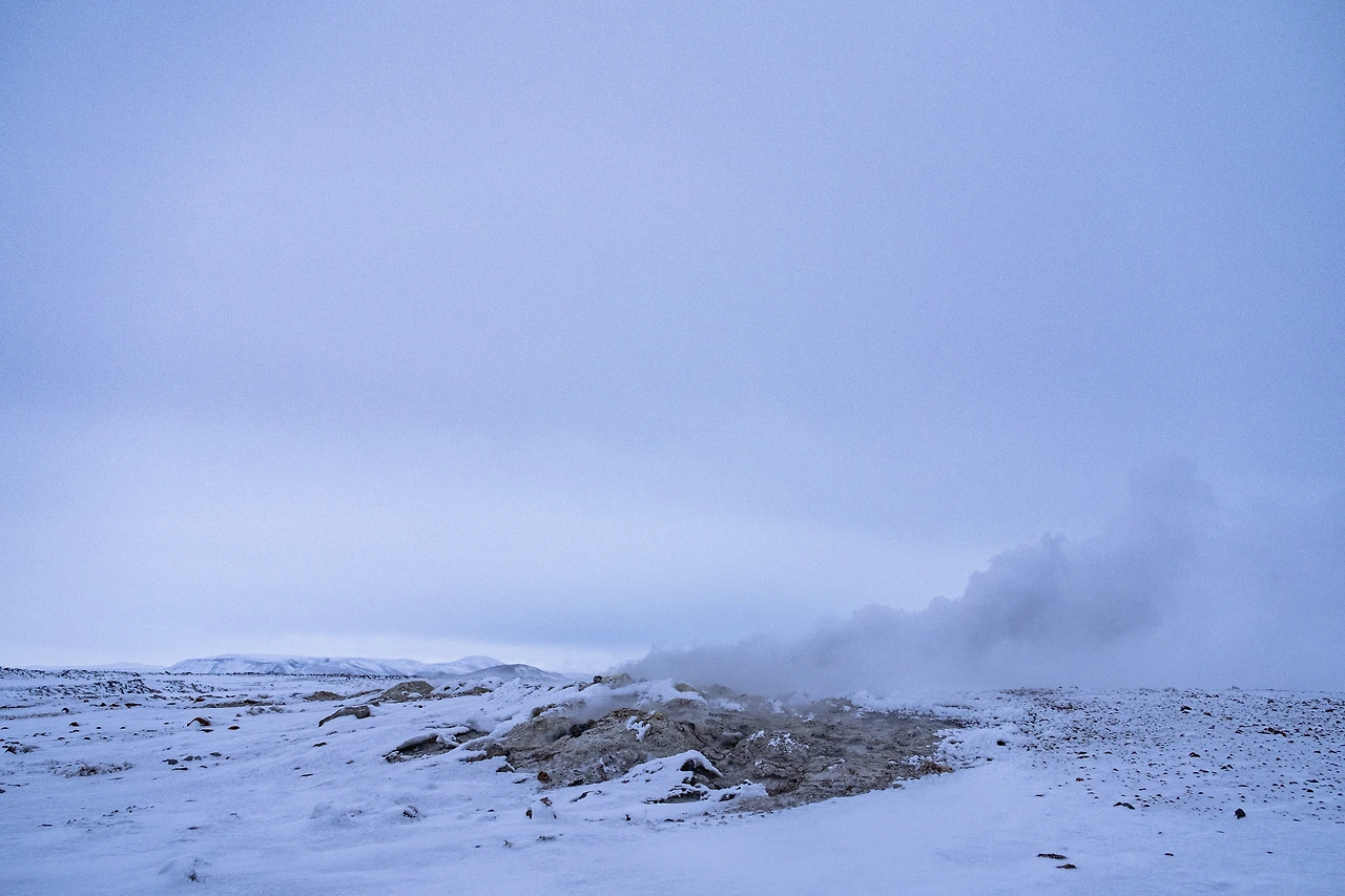 레이캬비크 근교에 위치한 골든서클에 게이샤르 간헐천이 있다면, 북부에는 이곳 흐베리르가 있었는데 게이샤르에서 보던 것보다 더 거대한 기운의 간헐천이 끓어오르고 있었다. 온도와 지열로 끓어오르며 피어오르는 연기도 그 갑절은 족히 되어 보였다. 레이캬비크와 남부 일대가 마치 인자하고 넉넉한 분위기로 품어주는 이 아이슬란드의 어머니 땅이라면, 이곳은 엄하고 금방이라도 호통칠 것만 같은 아버지 땅과도 같은 느낌이었다. 자욱한 연기와 맞부딛히는 겨울 추위가 만들어내는 비경이 제법이라 느끼며 그 공기의 흐름에 주목하며 셔터들을 누르며 천천히 흐베리르의 끓어오르는 핫스팟을 향해 걸어 들어갔다.
