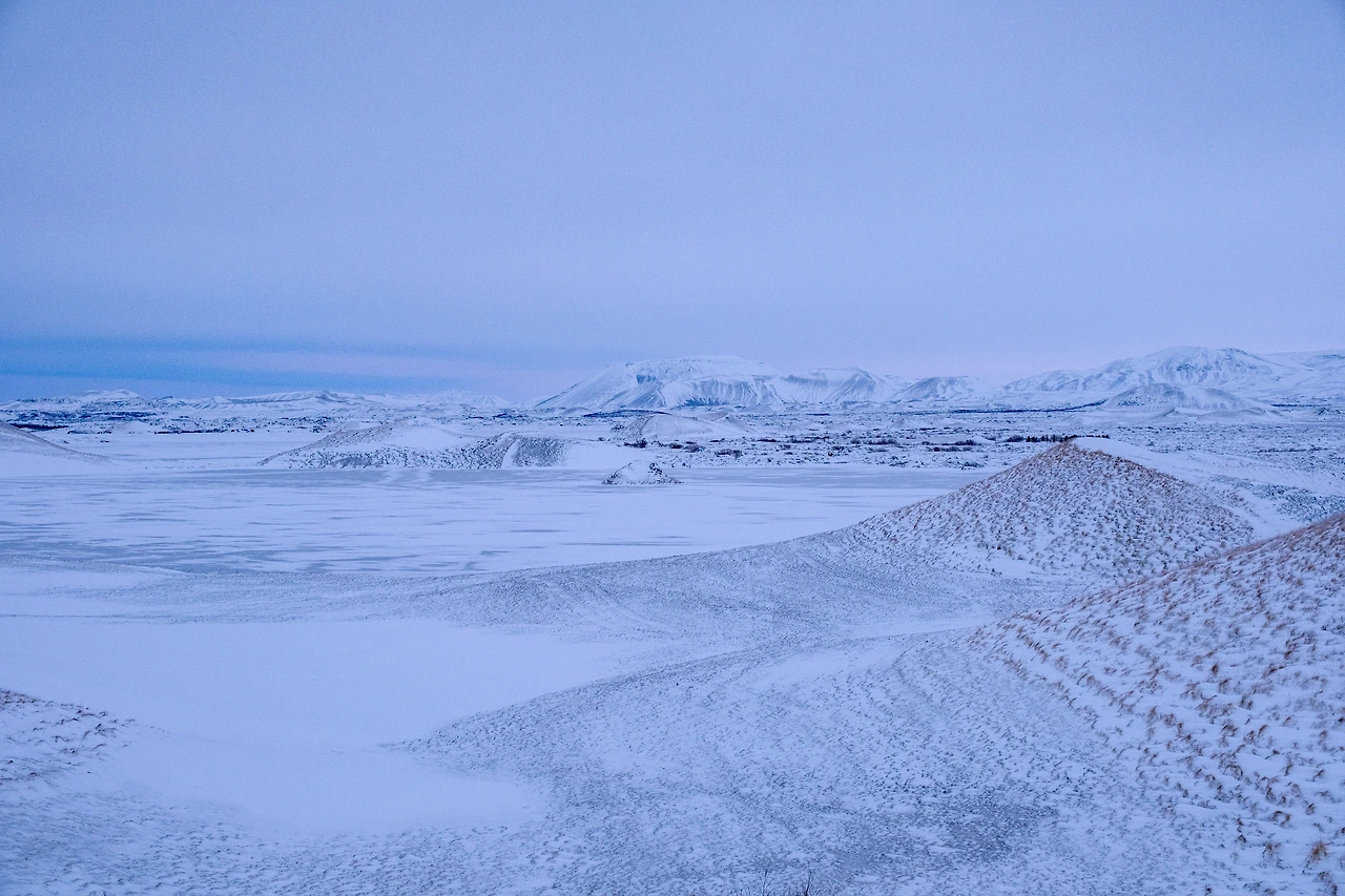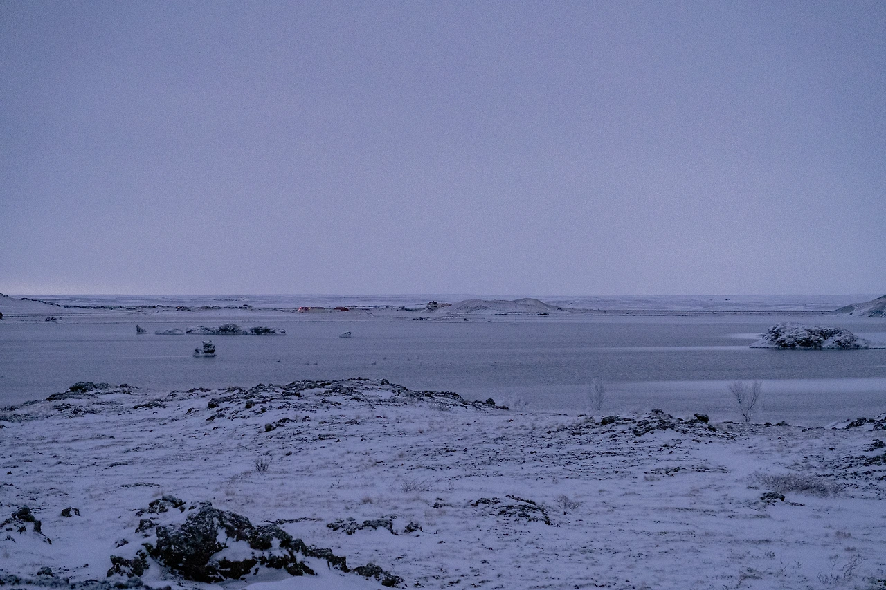 성난 화산이 활동했던 흔적인 분화구들이 미바튼 호수 주변에는 참 많았다. 그 분화구들이 점점 시야 속에 가까워져 오며, 이내 카메라 화면 이내에도 다 담기 어려울 정도의 크기가 될 때쯤에 반대편 호수 쪽을 보니, 마침내 겨울 속 미바튼 호수의 모습과 만날 수 있었다. 차에서 내려 그 거대한 호수와 마주 선 내 주변에는 아무도 없었다. 아이슬란드의 험난한 겨울 날씨를 뚫고 이곳까지 굳이 찾아올 사람은 아마 나뿐이었을 것이다. 그렇게 찾아온 나에게 미바튼 호수가 파노라마를 펼쳐 내 눈앞에 보였다.