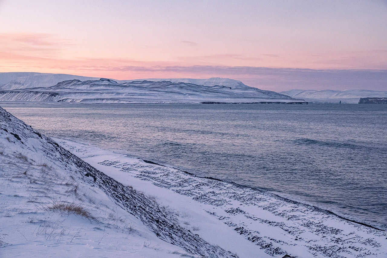 마침내 겨울철 Arctic Coast가 보여줄 수 있는 최고의 순간과 우연히 마주치게 된 그 순간은 아마도 북부에서 보낸 시간 가장 끝자락에서 발견한, 북부 최고의 하이라이트였을 것이다. 극야의 계절에는 해가 아무리 이른 시간에 떠 있어도 우리가 석양이라고 생각하는 정도의 붉은 노을이 지는데, 그 노을이 가장 정면으로 비추는 곳, 사선으로 빛이 들어오며 푸른빛과 뒤섞이는 하늘, 그리고 산등성이가 만드는 그림자 속에 드는 빛깔까지, 모든 각도와 시선의 방향에 따라 보이는 빛깔이 모두 달랐다. 같은 시간의 같은 공간인데 이렇게 모든 장면이 다를 수가 있을까? 이 장면에서 찍었던 사진들은 매 순간순간마다 '어차피 늦을 거 여기서 시간 좀 쓰면서 가자'라는 마음으로 찬찬히 뜯어보며 찍었고, 나중에 여행 이후에 보정을 하면서도 분명 같은 조건으로 작업을 하는데 어찌 원본과 보정 작업물이 이렇게 다 천차만별일 수 있을까 하는 생각을 정말 많이 했다.