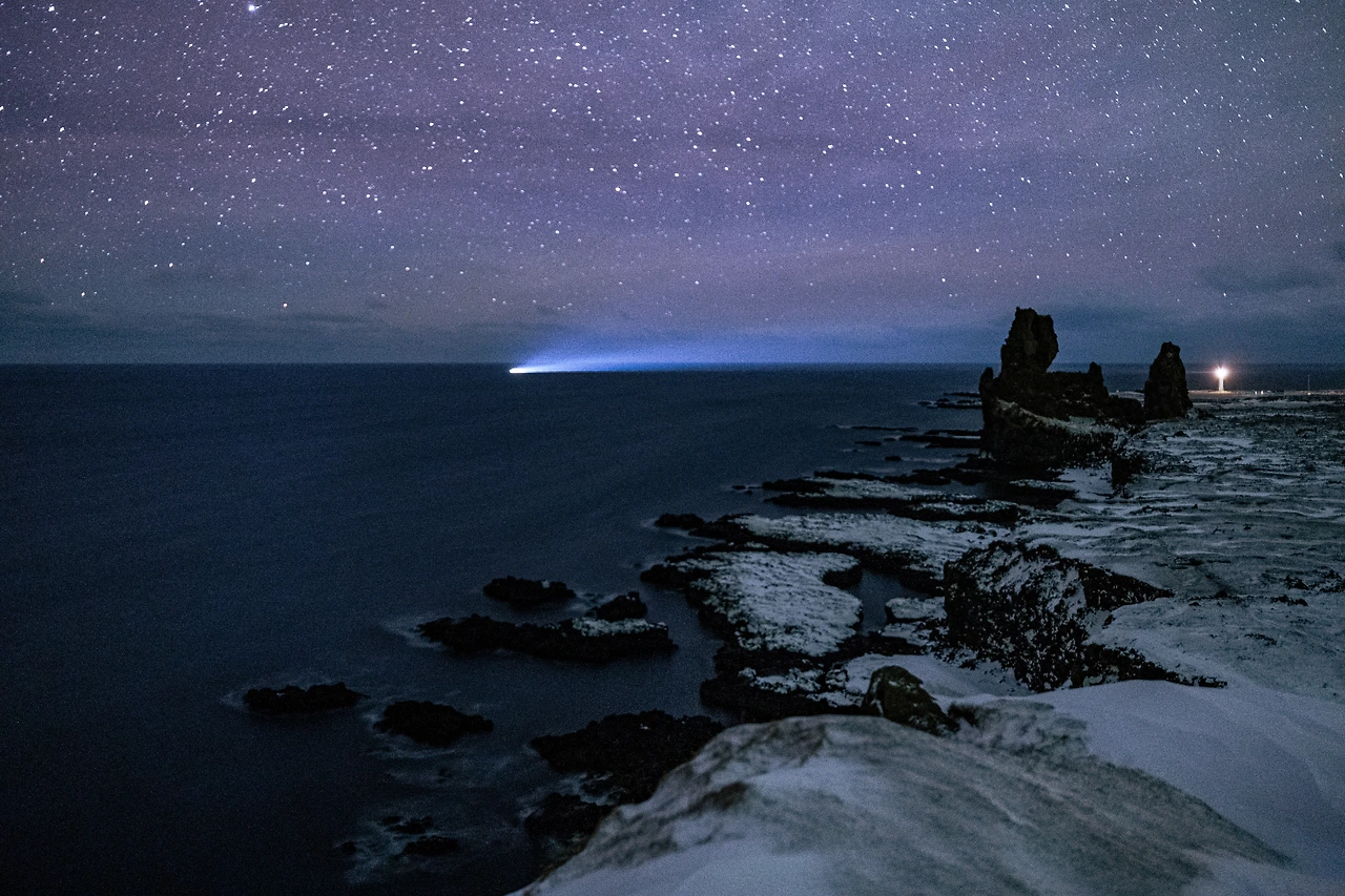가장 끝의 1분 1초까지 이제는 더 이상 후회 없다고 느끼며 나는 돌아가기 전, 미처 오로라와 담지 못했던 론드란가르의 주상절리를 보고 가기로 하여 이내 몇 분을 더 걸어 다시 마주 섰다. 그런데 그 순간에 어찌 보면 오로라 보다도 가장 귀중한 순간을 만날 수 있었는데, 주상절리를 따라 뒤편으로 보이던 등대가 불을 밝히고 있고, 그리고 그 등대를 바라보며 환한빛을 마주 쏘며 해안가로 들어오고 있던 한 어선이었다.