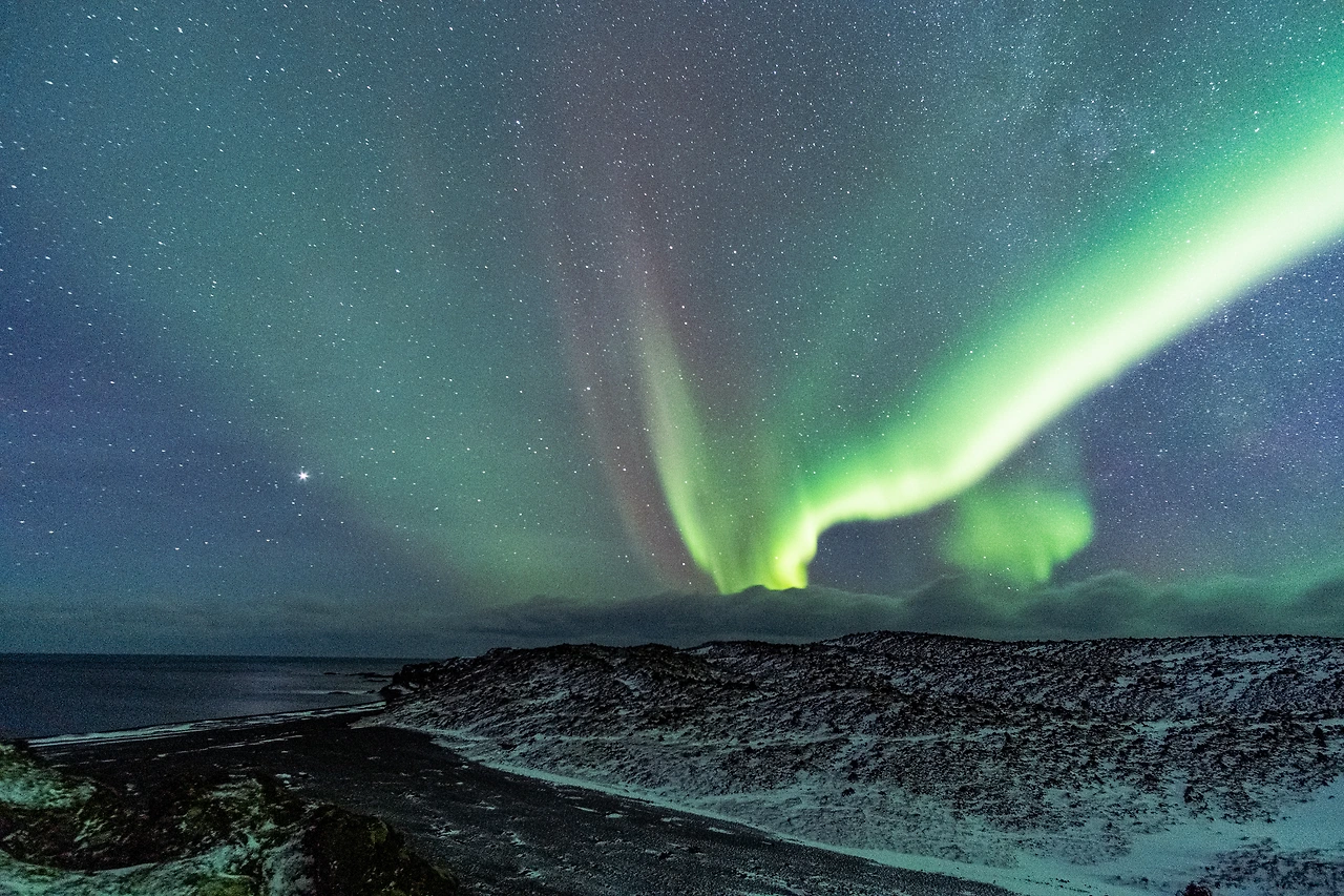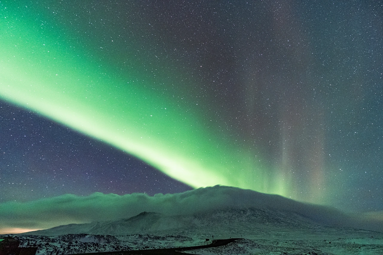 차에서 내리자마자 본 것은 나의 여행 마지막 날 밤을 실망시키지 않던, 아니 오히려 그에 상응하는 가장 환한 인사를 건네는 아이슬란드의 밤하늘이라는 생각이 들던 모습의 환한 초록빛 오로라였다. 차에서 내려 그 뒤편으로 가장 먼저 본 것은 주차장으로 들어오던 길을 따라 보이던 것은 오늘 하루 내내 나를 가장 높은 곳에서 굽어 내려다보던 스네이펠스네스 요쿨, 그 위에 잠시 걸터앉아 머물고 있던 구름, 그리고 그 위로 사선으로 펼쳐져 쏘아져 가던 오로라 빛줄기였다.