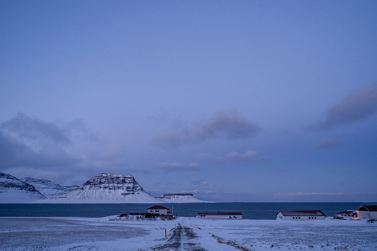 스네이펠스네스 반도의 이 작은 동네에서 이렇게나 많은 이야기를 남겨놓고 가게될 것이라고는 사실 예상하지 못했기 때문에, 귀향에 대한 감정과 별개로 떠나기 전에 잠시 숙소에서 보이던 동네의 전경과 저 멀리 바다까지 잠시동안 바라보았다. 22년 겨울의 대숲사진가의 일부를 이 동네에 두고 간다는 생각을 하며, 고개를 돌리니 바다 반대편으로 하늘이 밝아오고 있었다. 다시 해가 뜨기전에는 스네이펠스네스 반도를 벗어나야 했기에 이제 더는 지체하지 않기로 마음 먹고 차에 올랐다. 약 이틀 동안 얼굴도 본적 없었지만, 좋은 숙소를 마련해 주었던 에어비엔비 호스트에게도 마음 속으로 인사를 전했다.