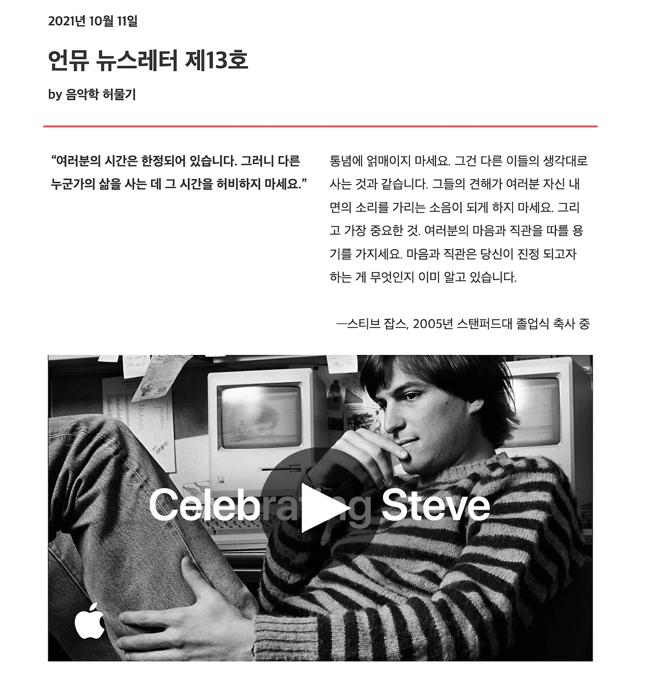 〈언뮤 뉴스레터〉는 음악학자 계희승 선생님이 2021년 매주 한 번씩 정기적으로 발행하던 뉴스레터입니다. 제19호까지 발행되었고 지금은 발행 중단되었지만, 지금 읽어 봐도 여전히 유용하고 의미 있는 내용이 많아요. 기 발행된 뉴스레터는 여기를 눌러 확인할 수 있어요.