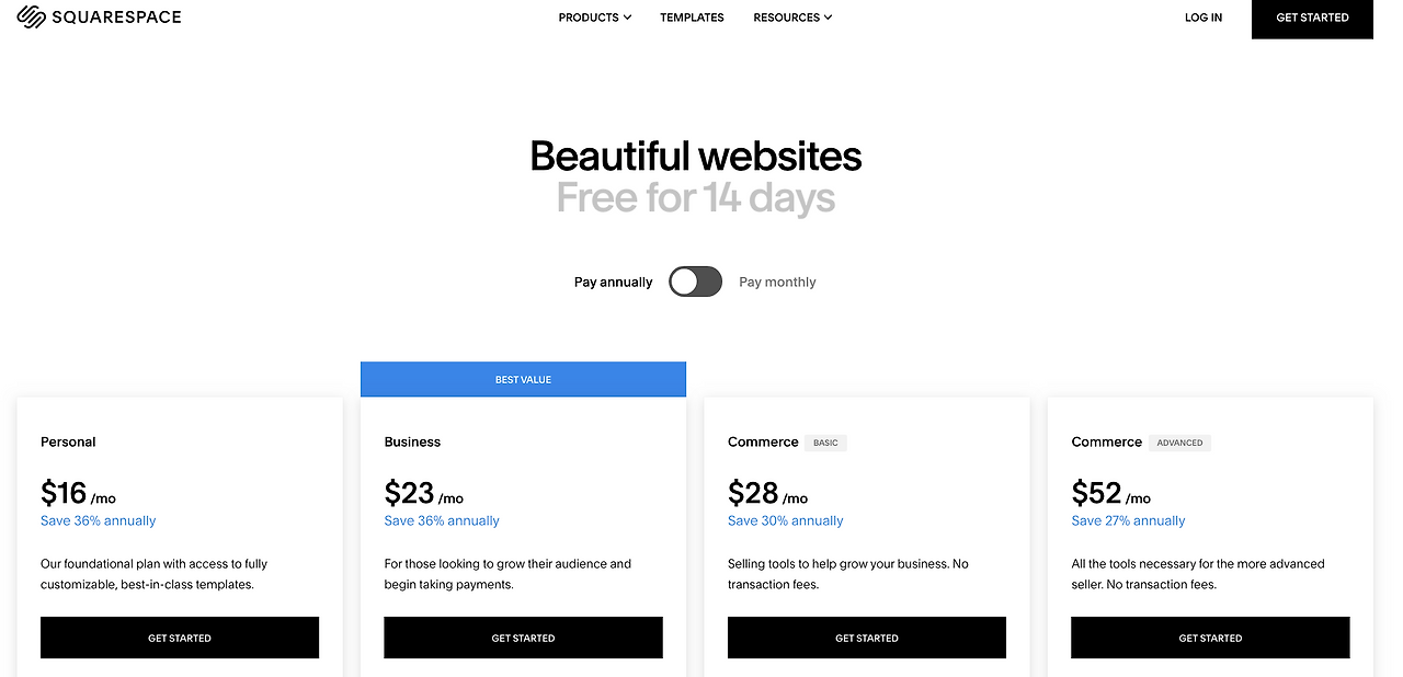 스퀘어스페이스의 가격은 $16, $23 깔끔하다.