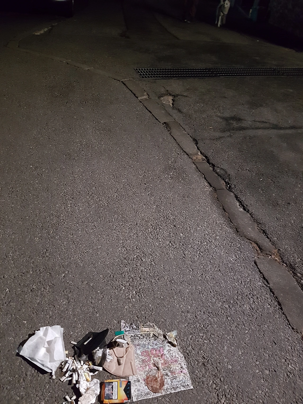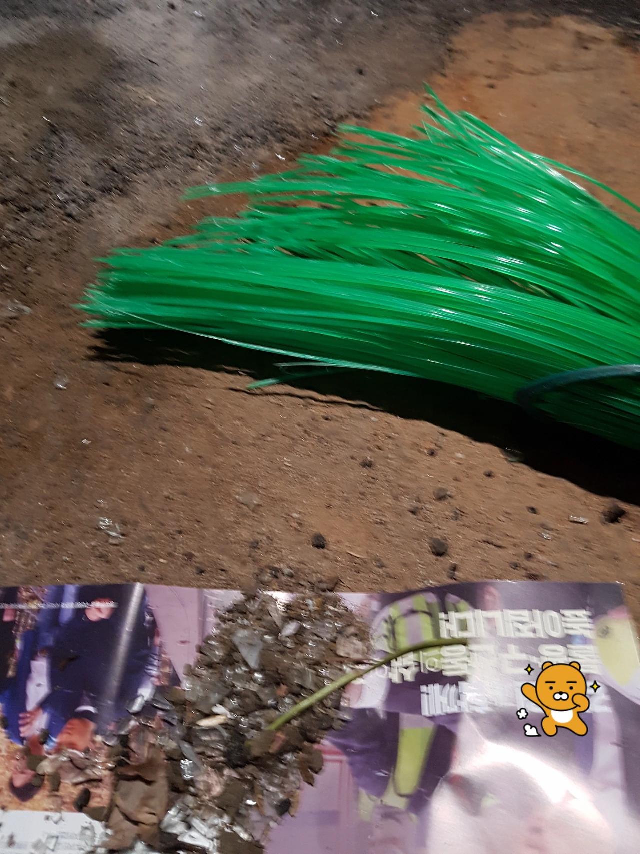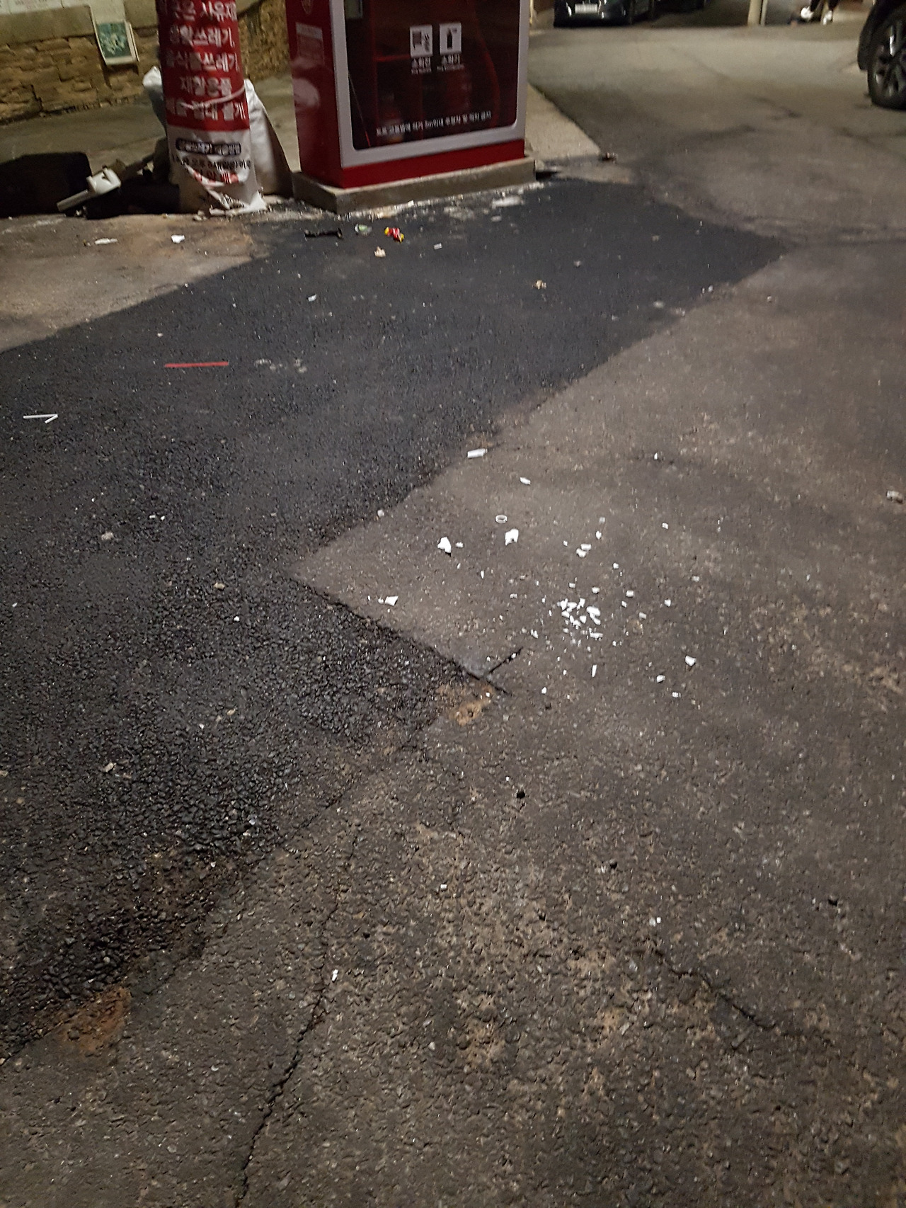 역시 집앞 골목. 떨어져 있는 플라스틱 조각들. 유리 못지 않게 날카롭다. 조심조심 장갑끼고 줍다.(집게로는 안 집어짐)