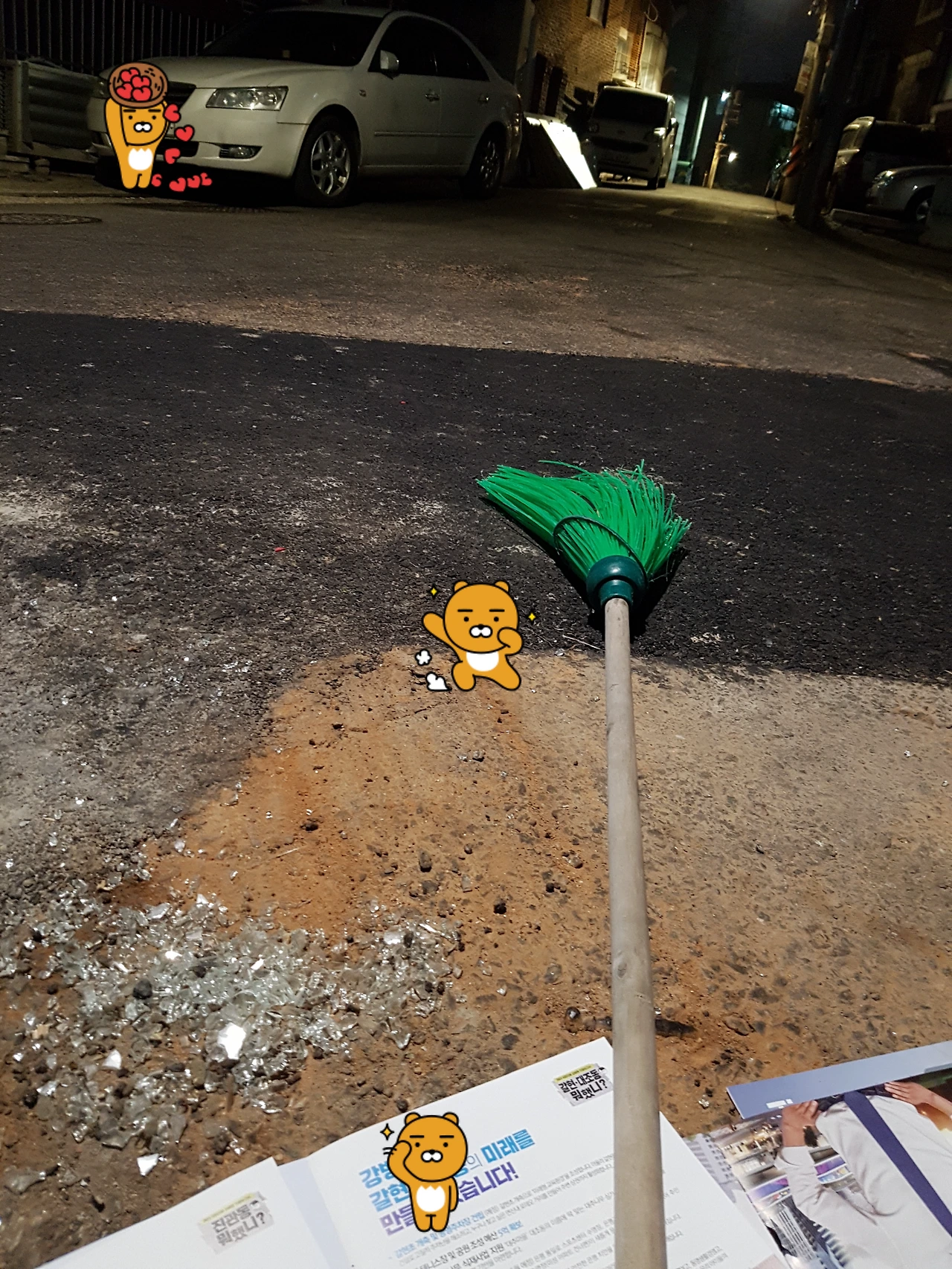 2022년 마지막날 12월 31일, 집앞 골목의 유리조각을 빗자루로 쓸어담으면서. (유리를 싼 종이가 인명, 지명 나온 유인물이라 스티커 붙임)