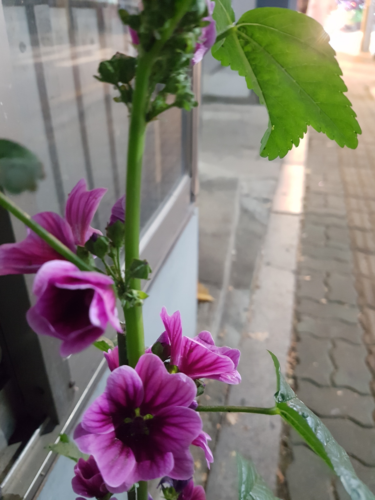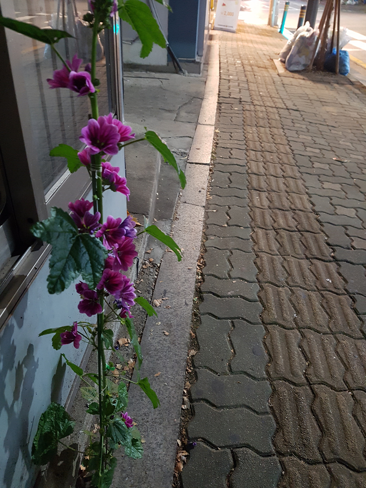 작년 늦가을까지 가게 앞 갈라진 아스팔트 바닥 틈에 피어있던 아욱꽃. 도시에 길들여지지 않았다고 할까, 뭐랄까 만만치 않은 야생의 느낌을 팍팍 전해주는 색감에, 키가 큰 식물. 잡초 같은 생김새가 좀 신기해서 한참을 들여다본 적이 있었다.