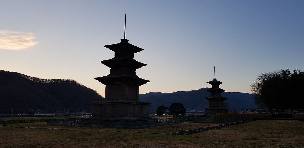 해파랑길 자르고 감은사지에 도착했을 때는 하늘이 남은 빛을 땅으로 내려보낼 즈음이었다.