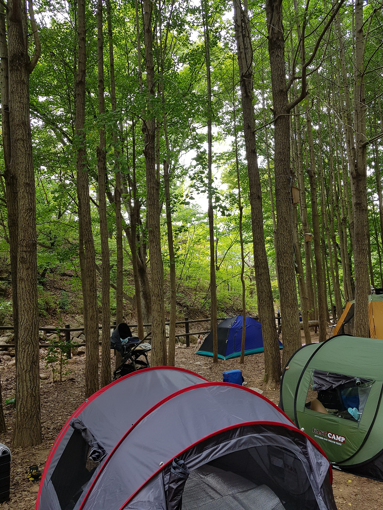 텐트를 치고 소박하게 휴일을 보내는 사람들이 있는 숲의 벤치에서 물을 마시고 잠시 초록빛을 즐겼다.