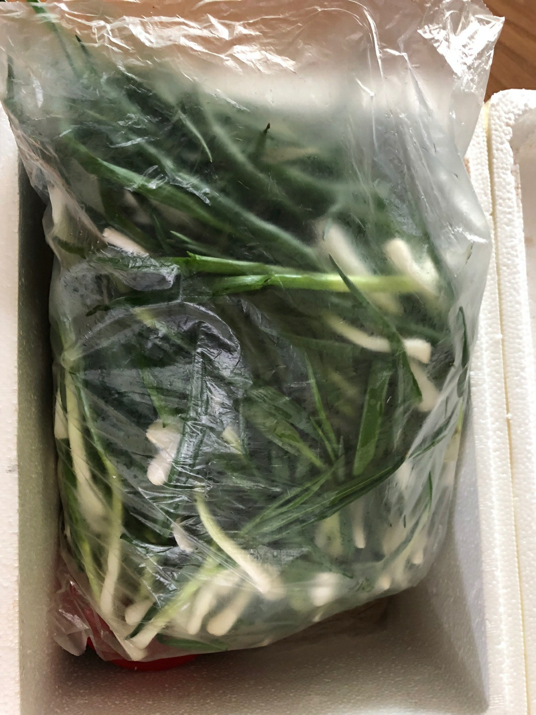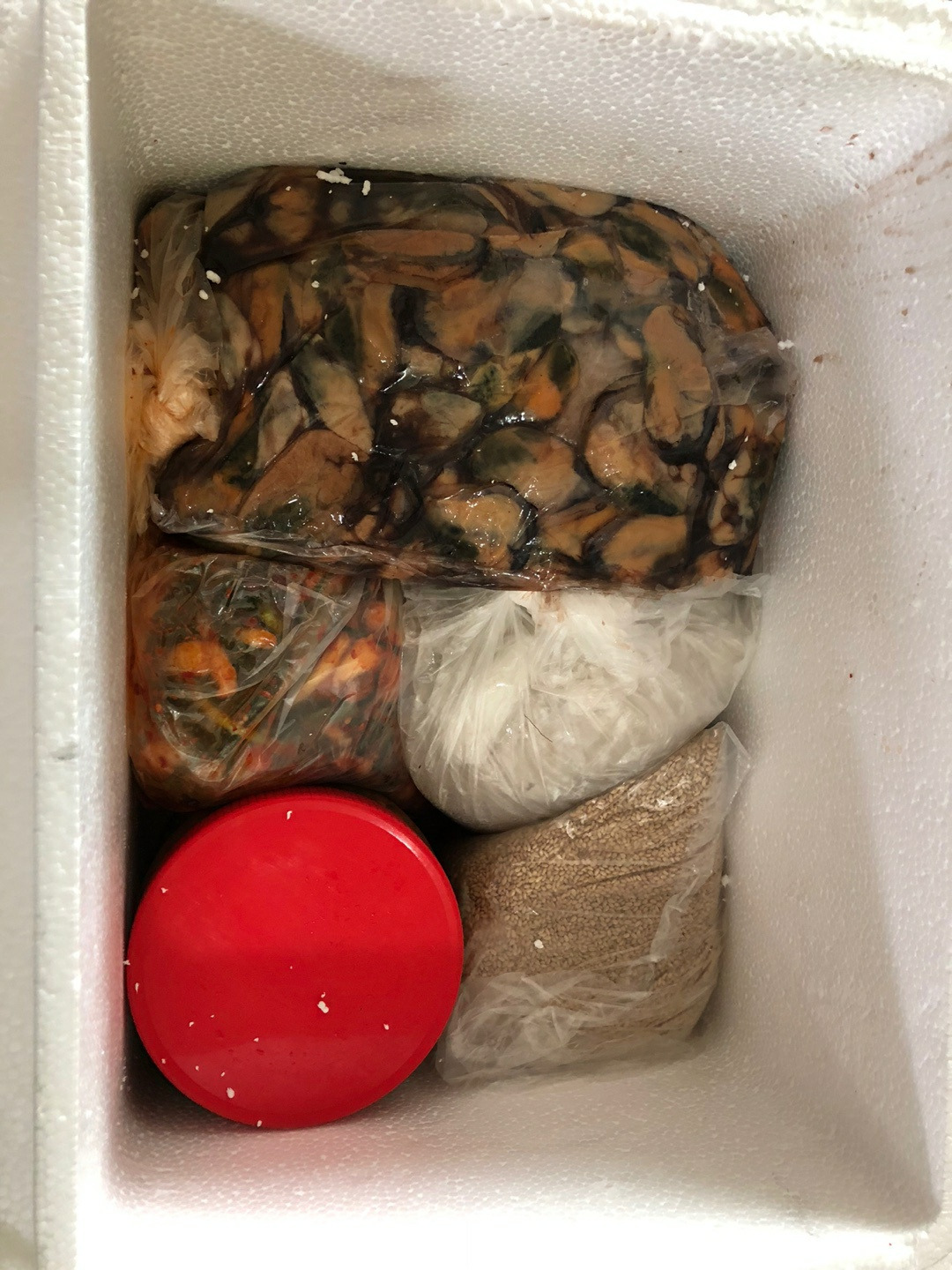 사진만 봐도 무엇 무엇이 들어있는지 다 보이는 듯하다. 쪽파는 엄니네 텃밭에서 뽑은 걸 껍질 벗겨 깨끗이 씻어 담아 보내셨을 테다. 홍합은 옆집 사는 아드님 뱃일하다 바다에서 채취한 걸 나눠주셨을 테고. 먹음직스런 쪽파김치도 담아 보내셨고, 곰국도 끓여 꽁꽁 얼려 넣으셨다. 참깨, 된장도 한통 보내셨고.... 아~ 동글동글 그 이름도 어여쁜 달래도 씻어 보내셨다.