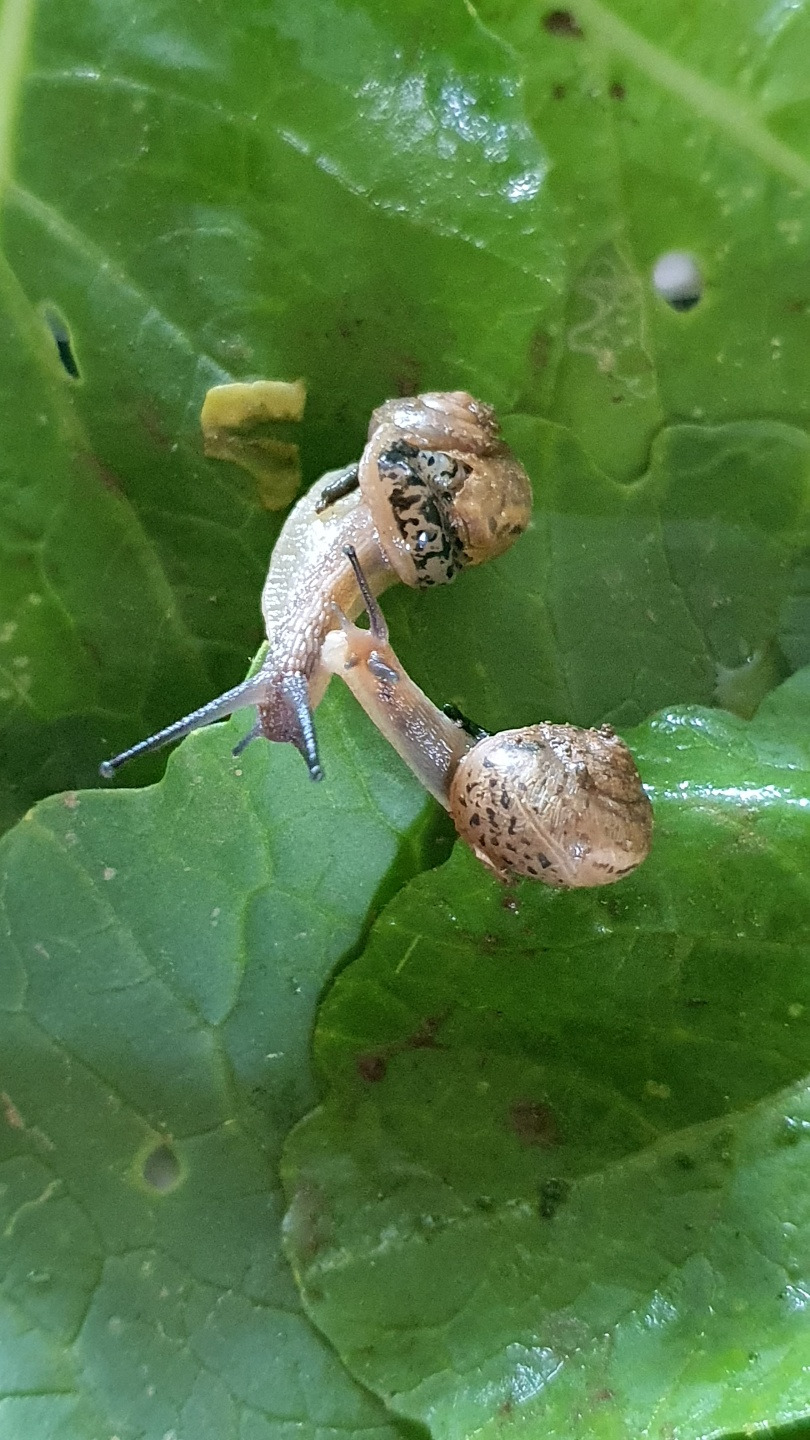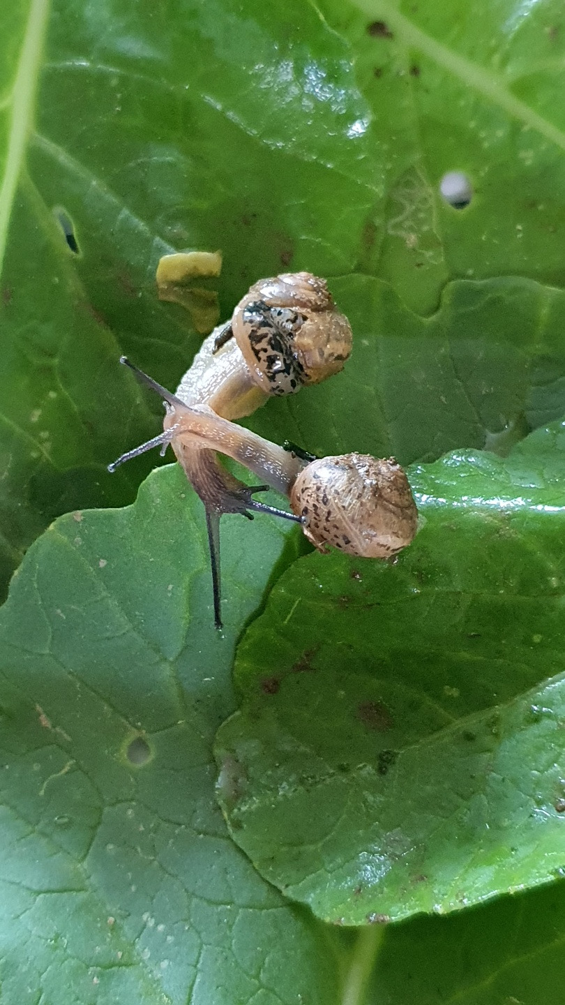 독채를 캠핑카처럼 지고 다니고 있으니... 애벌레였음 열무고 상추고를 떠나 냅다 집어던지며 한바탕 호들갑을 떨고 남았을 텐데, 집 있는 달팽이는 왠지 있어 보여서인가(?) 텃밭에 남은 이파리 위에 두 마리를 올려주었다.