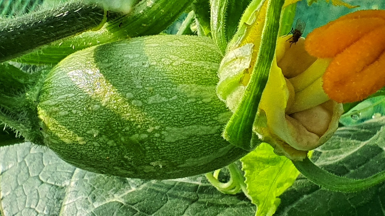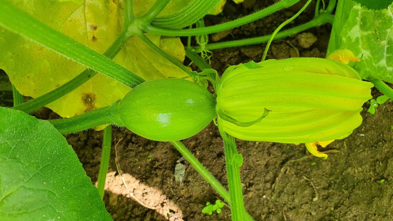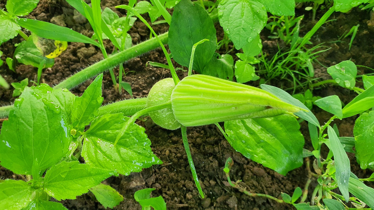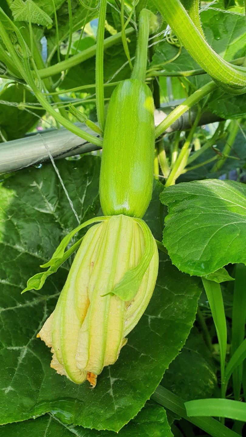 애호박! 마트에서 파는 딱 그 크기일 때 따줘야 한다. 마트의 진열된 꽉 쬐는 비닐 코르셋 같은 옷을 입히는 분명한 이유가 있었다. 따야 할 시기를 놓치면 거인 호박같이 뻥튀기되어 맛도 없어지고 거인 호박으로 죽 쑤어 먹어도 맛이 없을 거 같다.