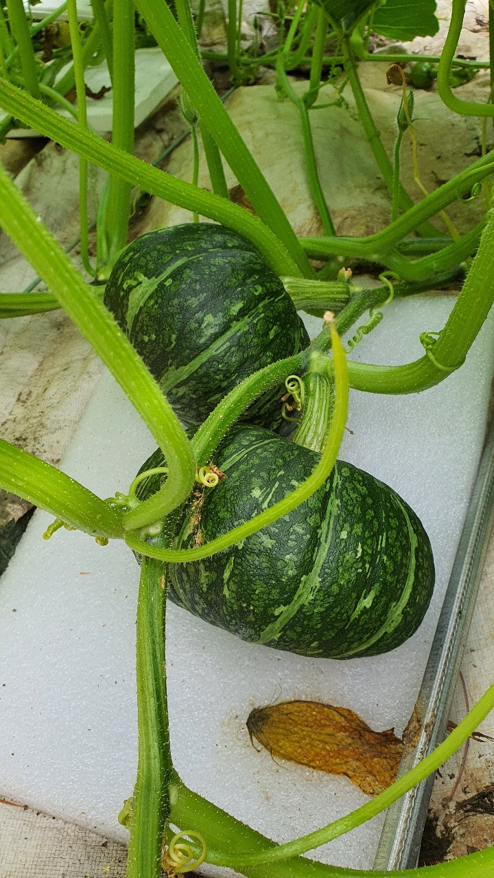 우리 집에 도착한 작은 맷돌호박 3개와 호박이파리.