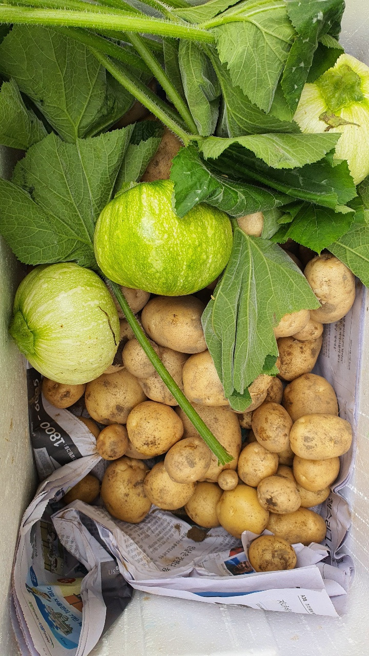 작은 씨앗이나 모종, 씨감자가 천배 만 배로 불어난 수확량. 농사법을 잘 알려주신 농장주인 분께 감자와 맷돌 호박 듬뿍 나눠드리고, 나오다가 호박 농사 안 지으신 분께도 드렸다. 아파트 앞에 도착하니 재활용 분리수거하시는 분이 계신다. 얼굴도 처음 뵈었지만, 수확물이라며 감자와 호박을 나눠드렸다.