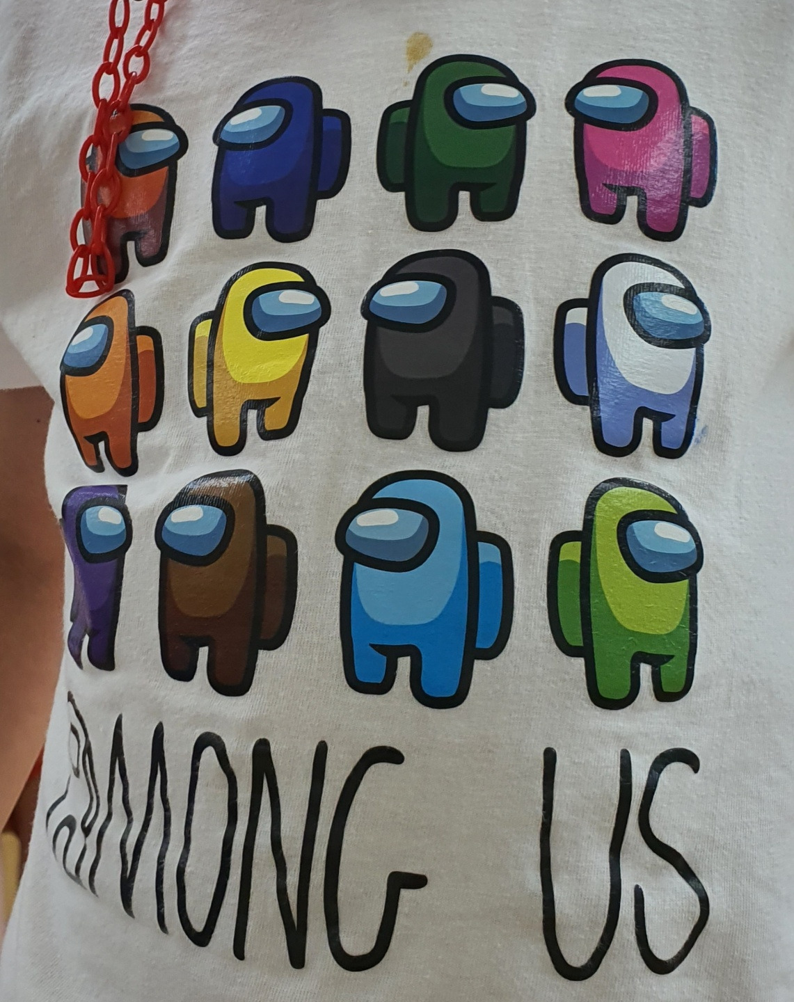 K가 입고 있는 옷의 캐릭터와 그린 그림이 닮아 있다. 영어로 친절히 적혀있기 까지. 그동안 아이들은 어몽 어스라고 대답한 거였다. 처음 들어봤던 말을 옹알이처럼 또 얼버무리는 듯한 말을 못 알아들었던 거고.