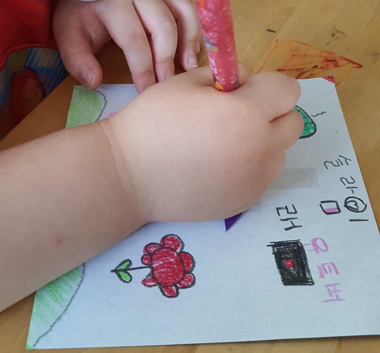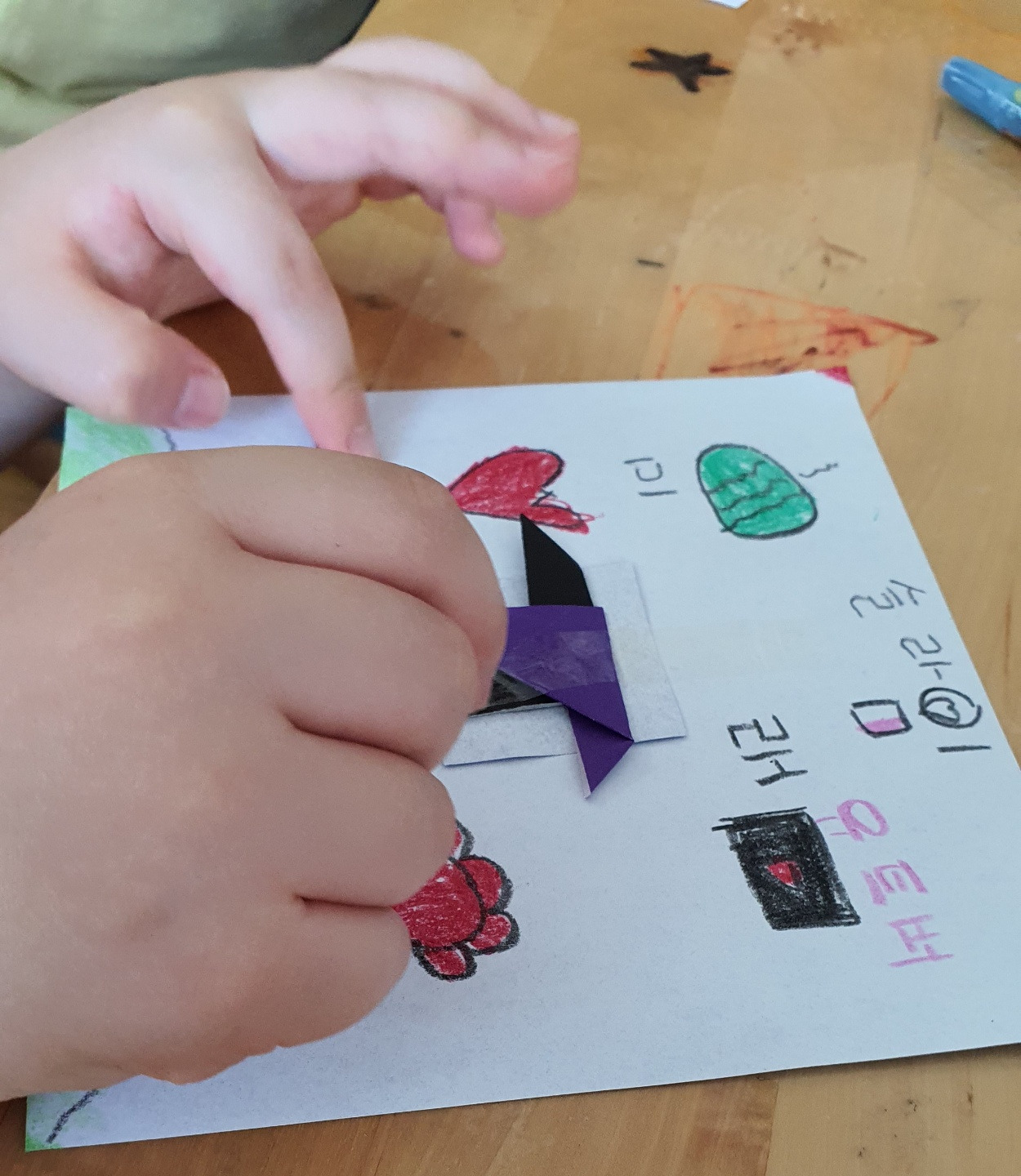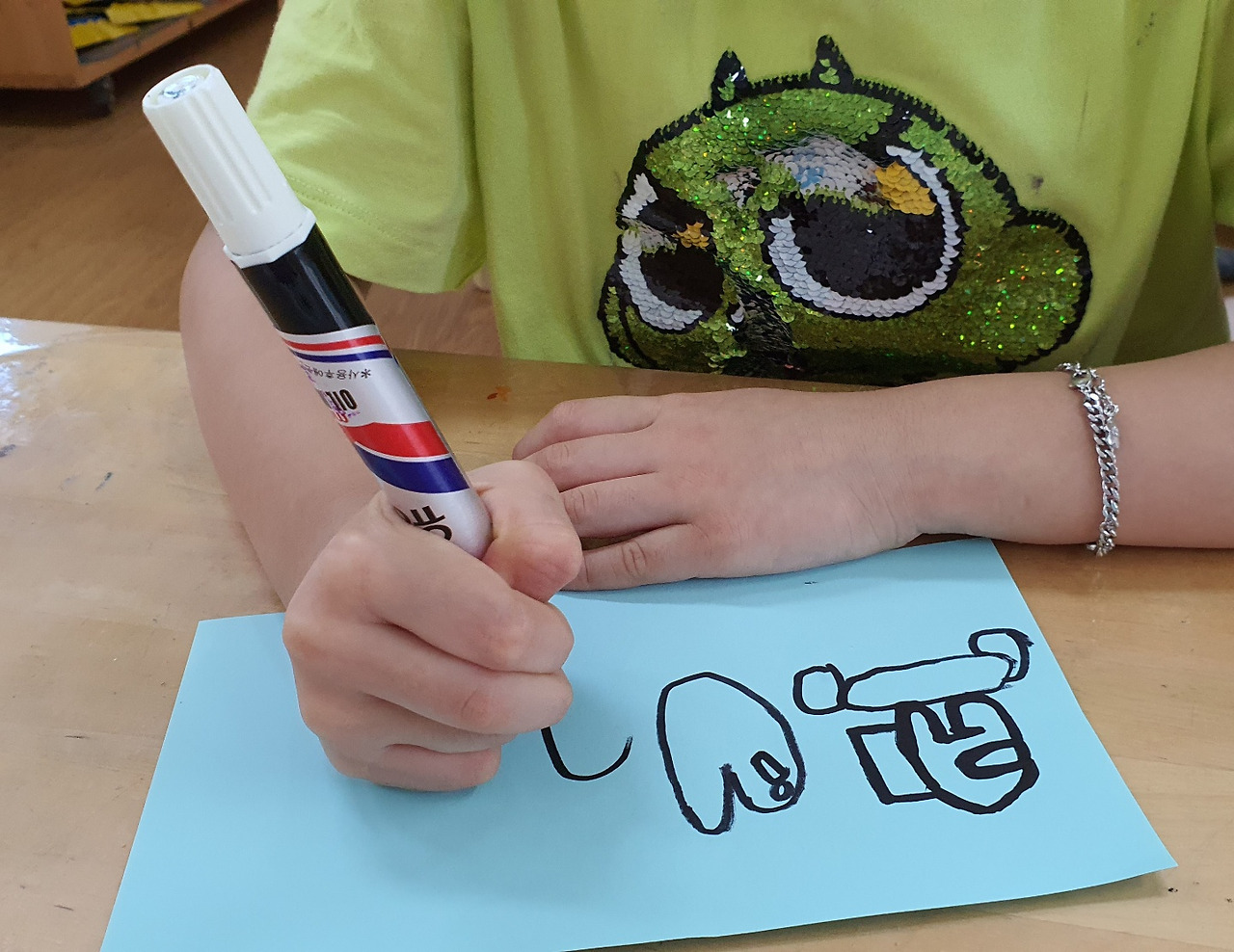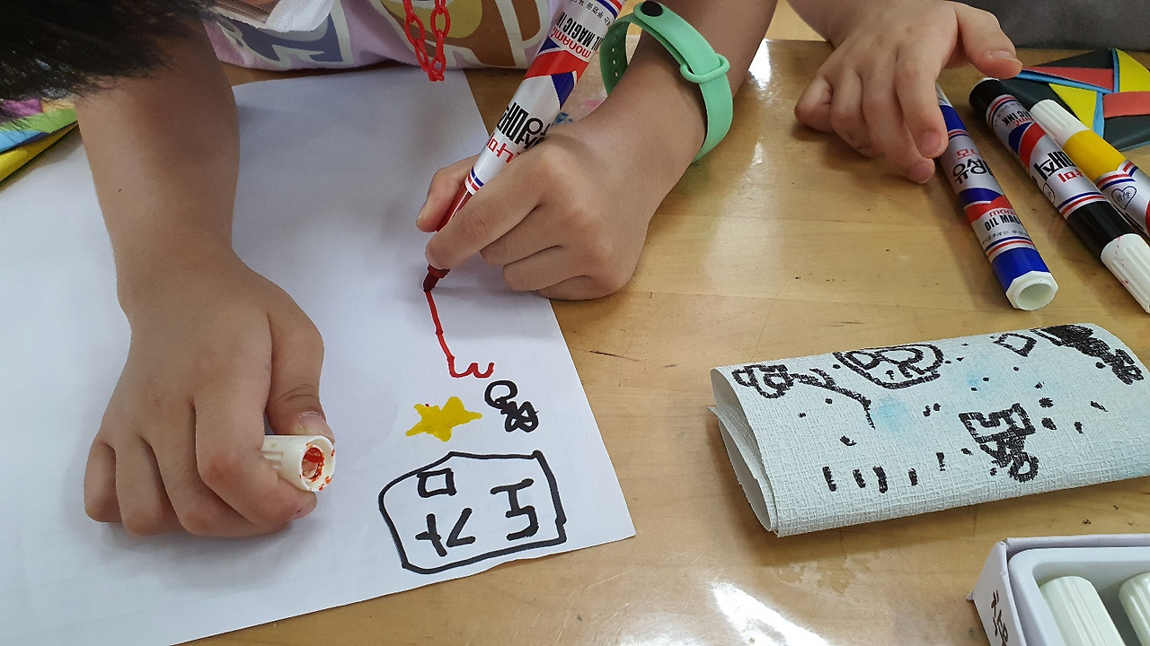 C와 L은 매직으로 일곱 살이 갖고 싶은 최애 아이템을 그리고 있다. 아이템이 많아야 무기 장착하듯 힘이 세진단다.
