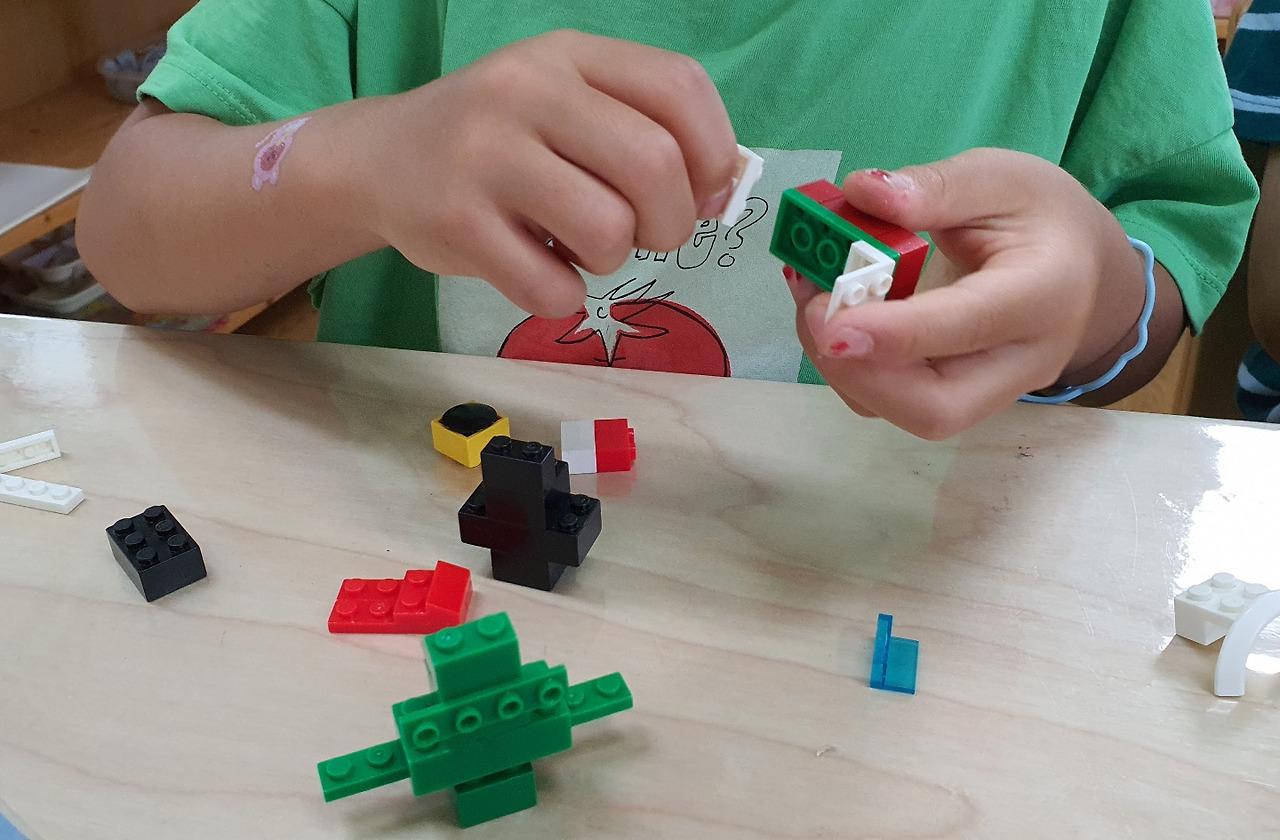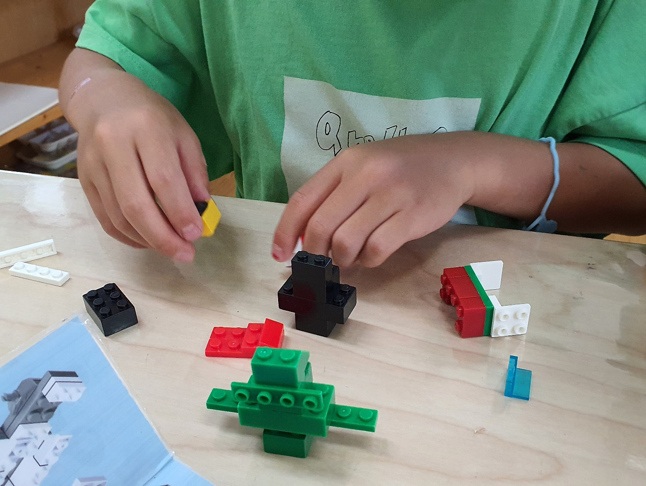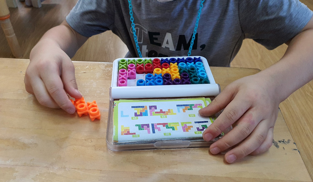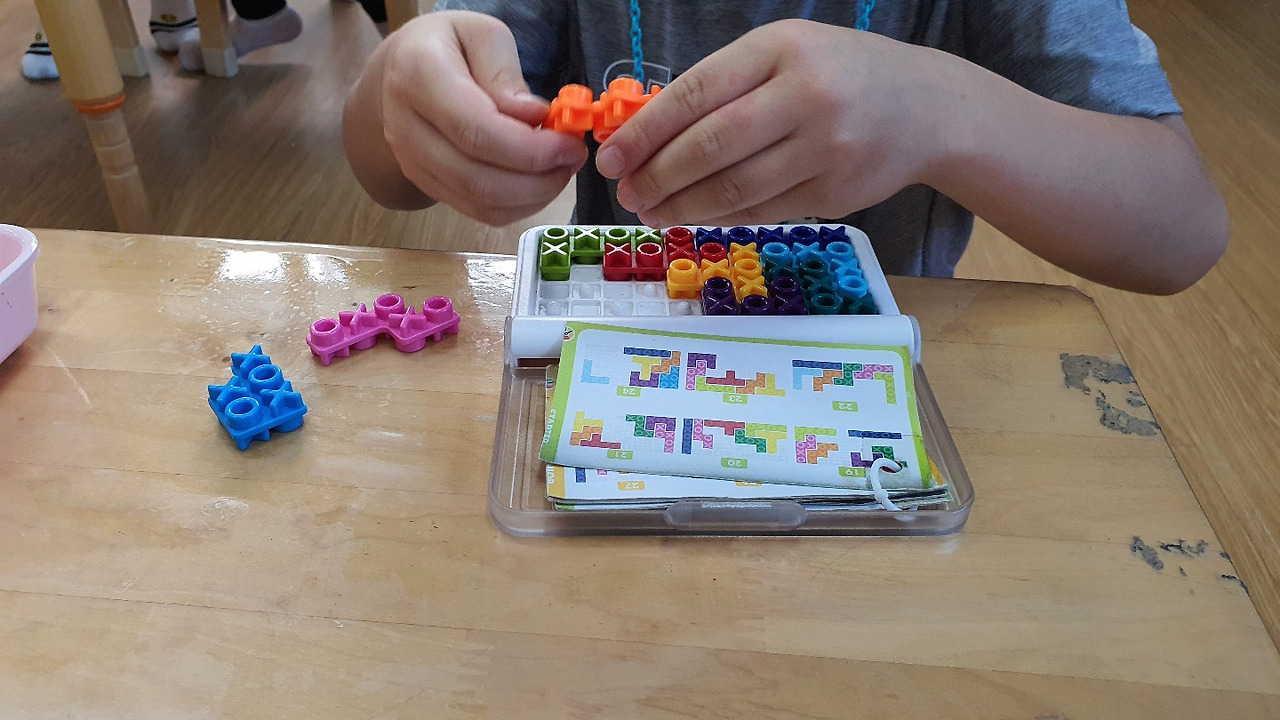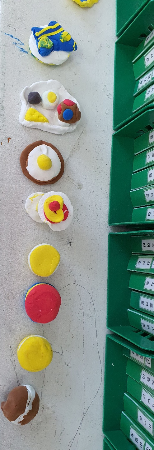 P의 마카롱과 M사 닮은 햄버거가 완성되어 정말 먹음직스럽게 보였다. 섬세하고 꼼꼼하고 작은 걸 잘 만들어내는 P. 몸집이 크고 살집이 있는 아이들이 의외로 진득하게 앉아 작고 작은 걸 잘 만들고 오리고 붙이는 편이다. 많은 친구들이 맛날 걸 만들어 말리느라 책장 위에 쭈욱 올려놓았다. 키가 크거나 마른 아이들은 자유놀이 시간마저 몸을 자유로이 움직이며 할 수 있는 팽이 조립해서 돌리는 게임을 좋아하는 듯.
