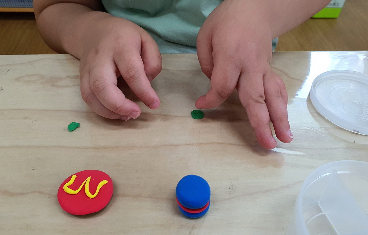 이미 만들어 놓은 수제 마카롱이 먹음직스럽게 놓여있다. M사 햄버거를 만들고 있다며 부연설명까지 해 준다. 패티는 좋아하니 크게 만들고, 양상추는 노랑과 파랑을 섞어 초록 상추로 만든 뒤 조금만 넣고. 마지막으로 빵을 올린 뒤 깨를 뿌려야 한다고 했다. 그 말을 듣던 옆에 앉아 L도 참깨를 만들어 올려야겠다며 예정에 없던 참깨를 두 개 만들어 올리다 더 이상 못하겠다며 다른 걸 빚고 있다. P는 개의치 않고 만들어 올려야 할 만큼 만들며 너무 작아 쉽지 않다는 말은 했다.