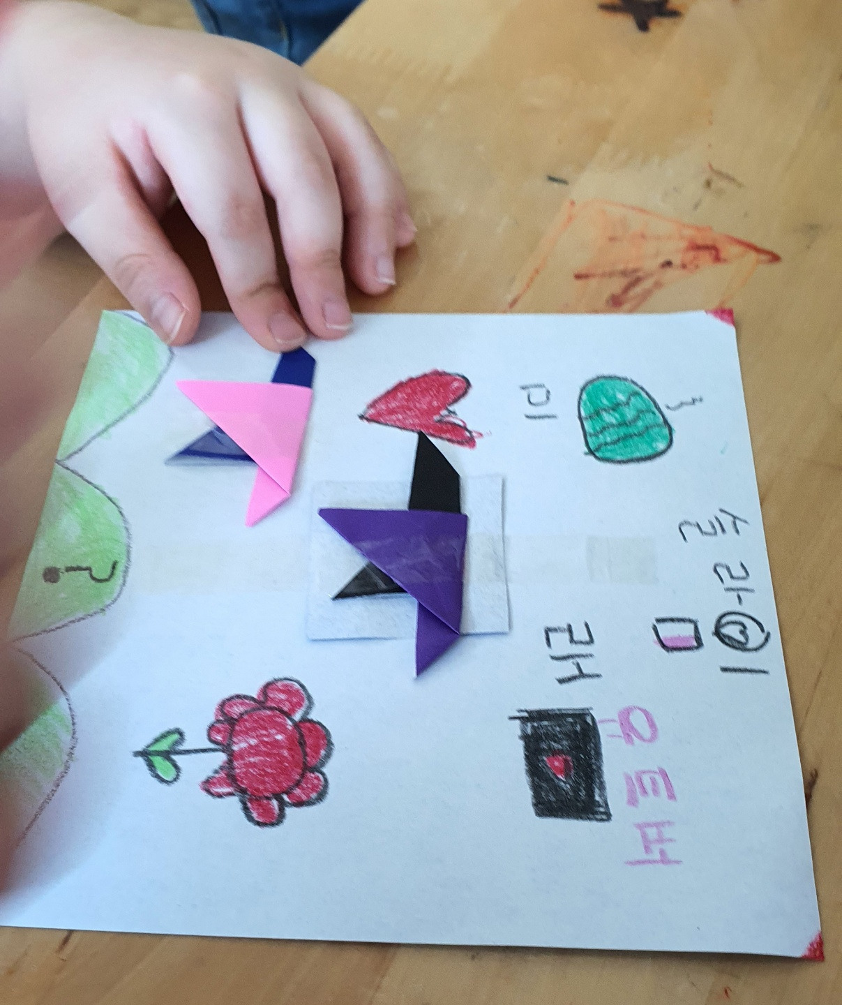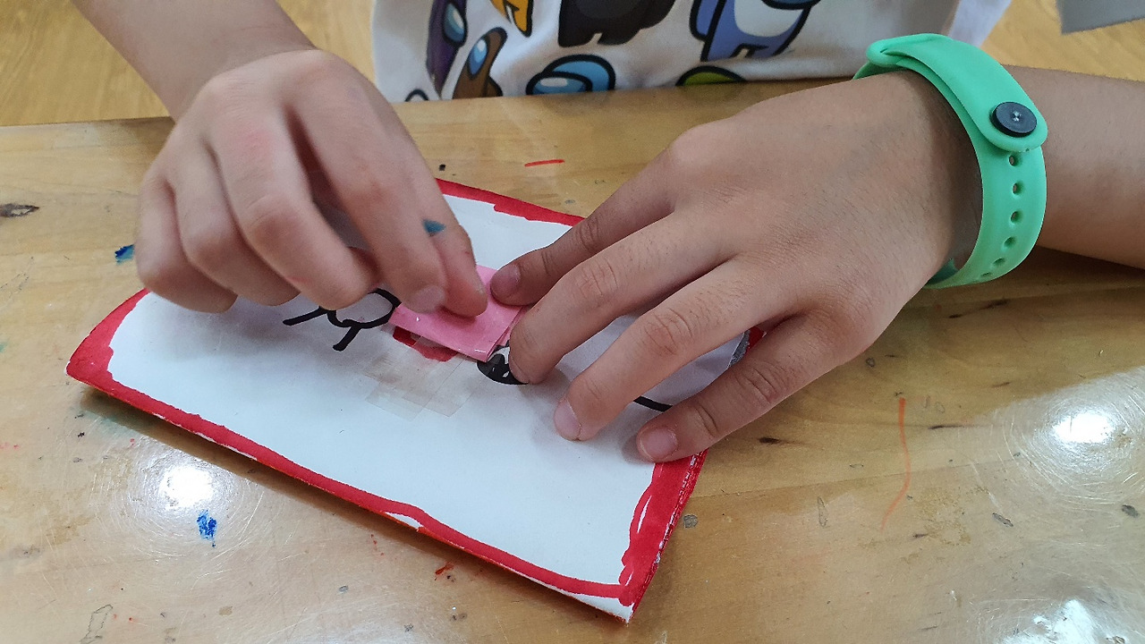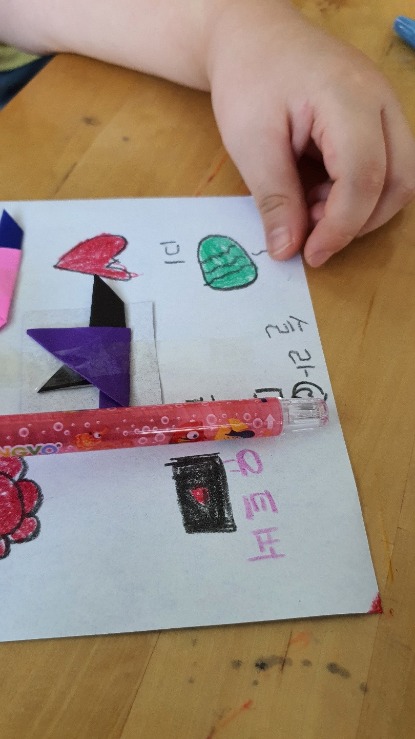 꽃, 별, 파랑, 빨강 뼈다귀, 산, 해 등 많은 것을 그려놓고 자기들 최애 아이템들이라며 선보여준다.