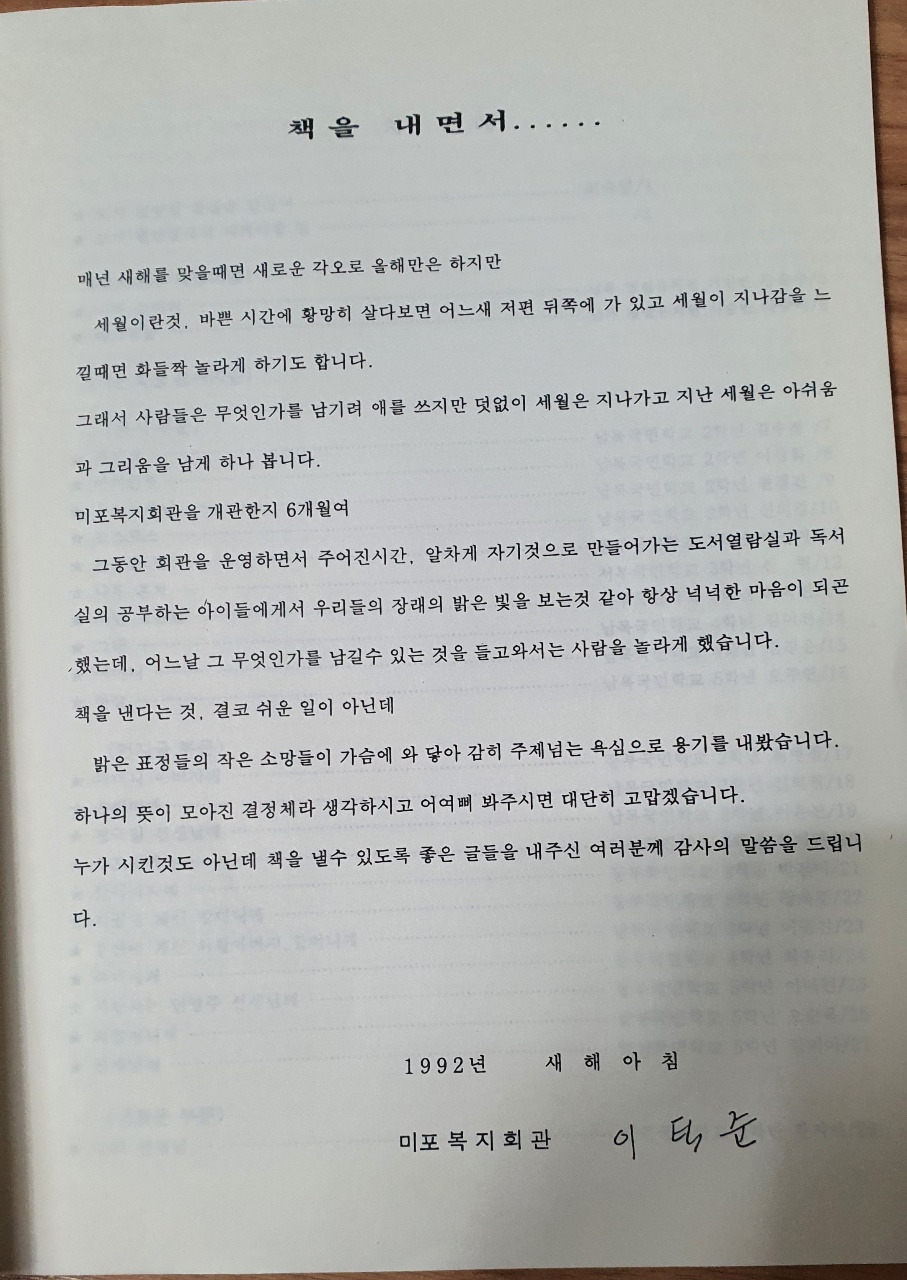 한 권은 복지회관 열람실을 이용하는 유치부에서 일반인에 이르기까지 다양한 사람들과 만든 문집. 당시 그곳에는 열람실에 비치된 책도 읽을 수 있고, 각종 참고도서가 구비되어 중, 고등학생은 교과서와 문제집만 있으면 자기 공부 얼마든지 할 수 있었던 지역주민에게 열린 공간이었다. 그 사람들과 함께