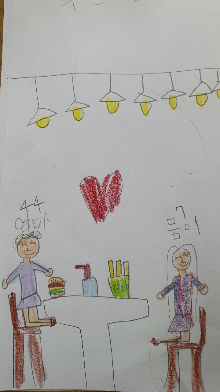 그렇게 엄마와의 아침 모습을 떠올렸다. 역시 지난번 자신을 엄마, 아빠의 큰 선물이라고 썼던 K는 햄버거 가게에서 44세 엄마랑 7살 주인공이 마주 앉아 햄버거와 감자튀김을 맛있게 먹는 걸 떠올렸나 보다.