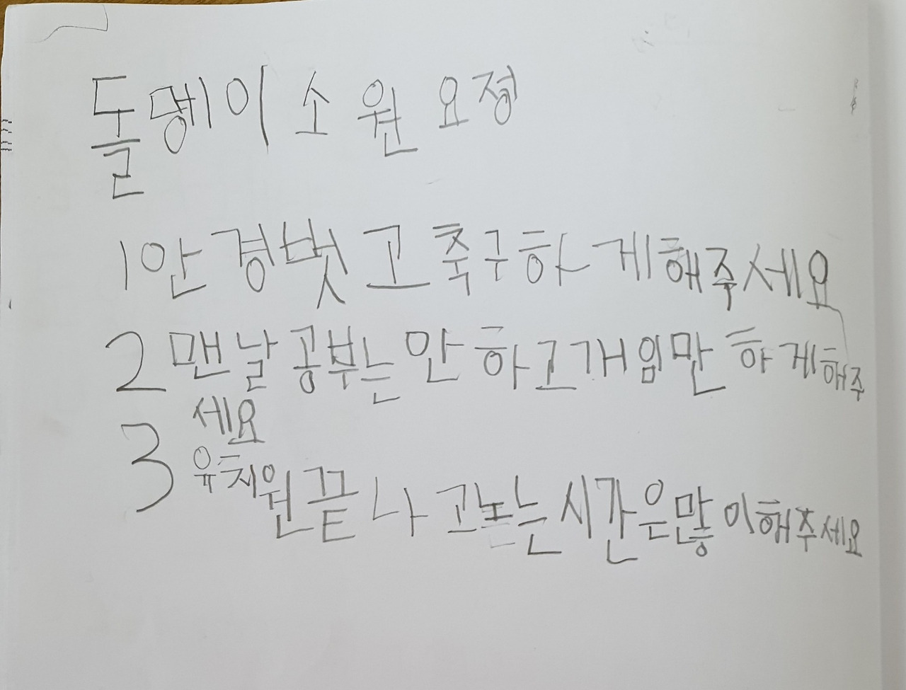 엄마, 아빠가 예쁜 말, 친절한 말, 화내거나 짜증내며 말하지 않았으면 좋겠다는 소원이 정말 많았다. 아빠가 맴매 좀 안 했으면 하는 친구도 있고.
