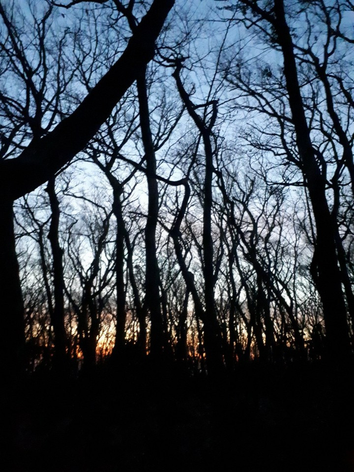 붉게 떠오르는 태양을 나무가 흡수하며 보여주는 조화와 아름다움