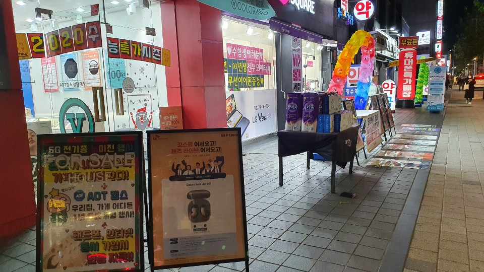 대로변 가게들은 아침시간 분주했다. 간밤에 들여놓은 물건들 줄 맞춰 진열하여 관심과 눈길 끌게 하여 주인 찾아가게 도와야 한다. 컨테이너 박스가 가게인 과일가게 아저씨, 잠자고 있는 과일들 불러 깨워 줄 세우느라 바쁘시다. 각종 통신사 휴대폰 가게들 축제 현장 저리 가라 할 정도의 불티나는 장을 펼쳐 놓으시네.