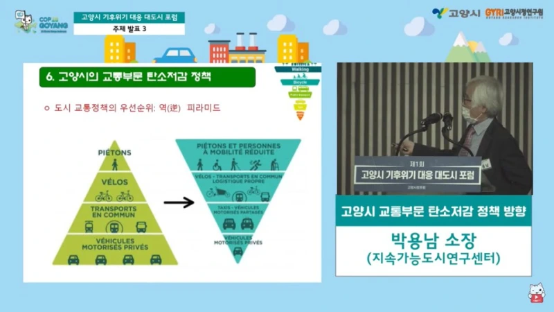 박용남 소장은 국제사회의 사례를 들어 고양시 교통부문 탄소저감 정책 방향을 제시했습니다.