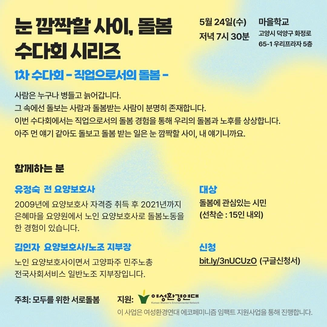 우리의 관심밖에 있는 무거운 주제의 돌봄 노동을 이렇게 나마 이야기하고 토론할 수 있는기회를 제공해주신 ‘모두를 위한 서로돌봄’과 ‘여성환경연대’ 감사드립니다~