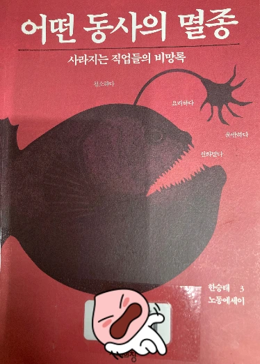 한승태의 <어떤 동사의 멸종>을 읽었습니다. AI에 의해 앞으로 '사라지는 직업들의 비망록'을 적은 글입니다. 비망록이란 죽음에 대한 애도이기도 하지만, 작가의 의도는 앞으로 같은 슬픔과 고통을 반복하지 말자는 뜻이라고 해요. 그러나 작가는 사라져 가는 이 직업들을 무겁게 다루지 않았어요. 심지어 경쾌하고 유쾌해요. 무거운 것을 가볍고 유쾌한 시선으로 표현한 것이 참 인상적이더군요.