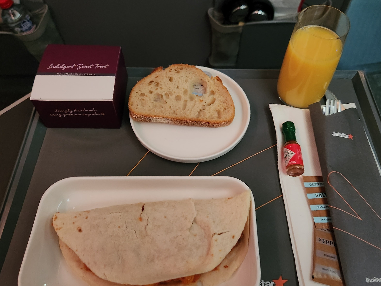 비즈니스 먼저 입장시켜 주는 소소한 즐거움도 누렸다. 비행기 입구를 기준으로 오른쪽은 이코노미, 왼쪽은 비즈니스로 구역이 나누어지는데 왼쪽으로 들어가는 기분은 낯설고도 좋았다. 젯스타 비즈니스가 대한항공 이코노미보다 저렴한데 기분은 더 좋게 만들어 준다. 맨 앞줄에 앉아 다리 공간도 여유롭다. 화장실도 가깝다. 올 때는 화장실이 가까워서 힘들었는데 지금은 화장실 가까운 게 특권처럼 느껴진다.