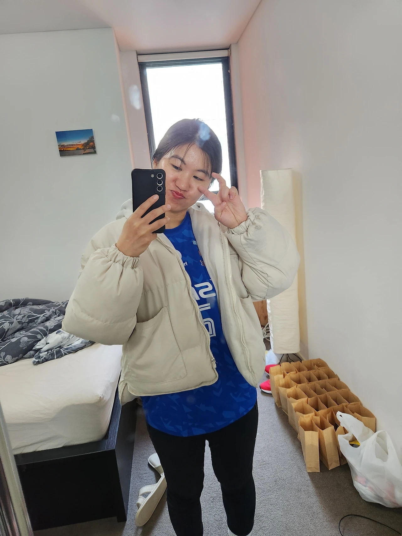 이번 여행은 사실 경기를 제외하면 다른 일정을 따로 잡진 않으려 했다. 왜냐면 지금 글 쓸 거랑 그림 그릴 거 한참 밀렸거든. 가만히 경치좋은 카페에서 글 쓰고 호텔에서 쉬고 싶었다. 근데 옵저버토리 공원도 좋다 하고 시드니가 워낙 유명한 도시인데 아무 데도 다니지 않으면 후회할 지도 몰라 나갈 준비를 했다. 옷은 역시나 유니폼. 셔츠 위에 입어봤다. 인스타그램에 보면 유니폼 예쁘게 잘 입는 언니들 많던데 나는 어째 그런 모양새가 안 나온다. 차라리 운동할 때 입는게 더 잘 어울릴 듯. 한글 적혀있어서 그런가 중국인이냐고 묻는 건 없어서 좋았다. 다만 지나가는 한국 사람들이 쳐다보는 거 같아서 좀 쑥스럽다. 누가 수원특례시라고 읽는 거 들었다. 그래도 당당히 걸으려고 했다.