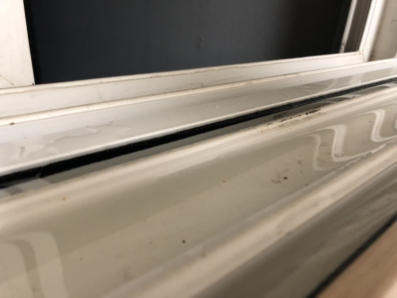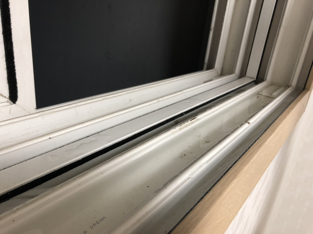 그 틈으로 들어찬 빗물이 창틀에 고여 있다.
