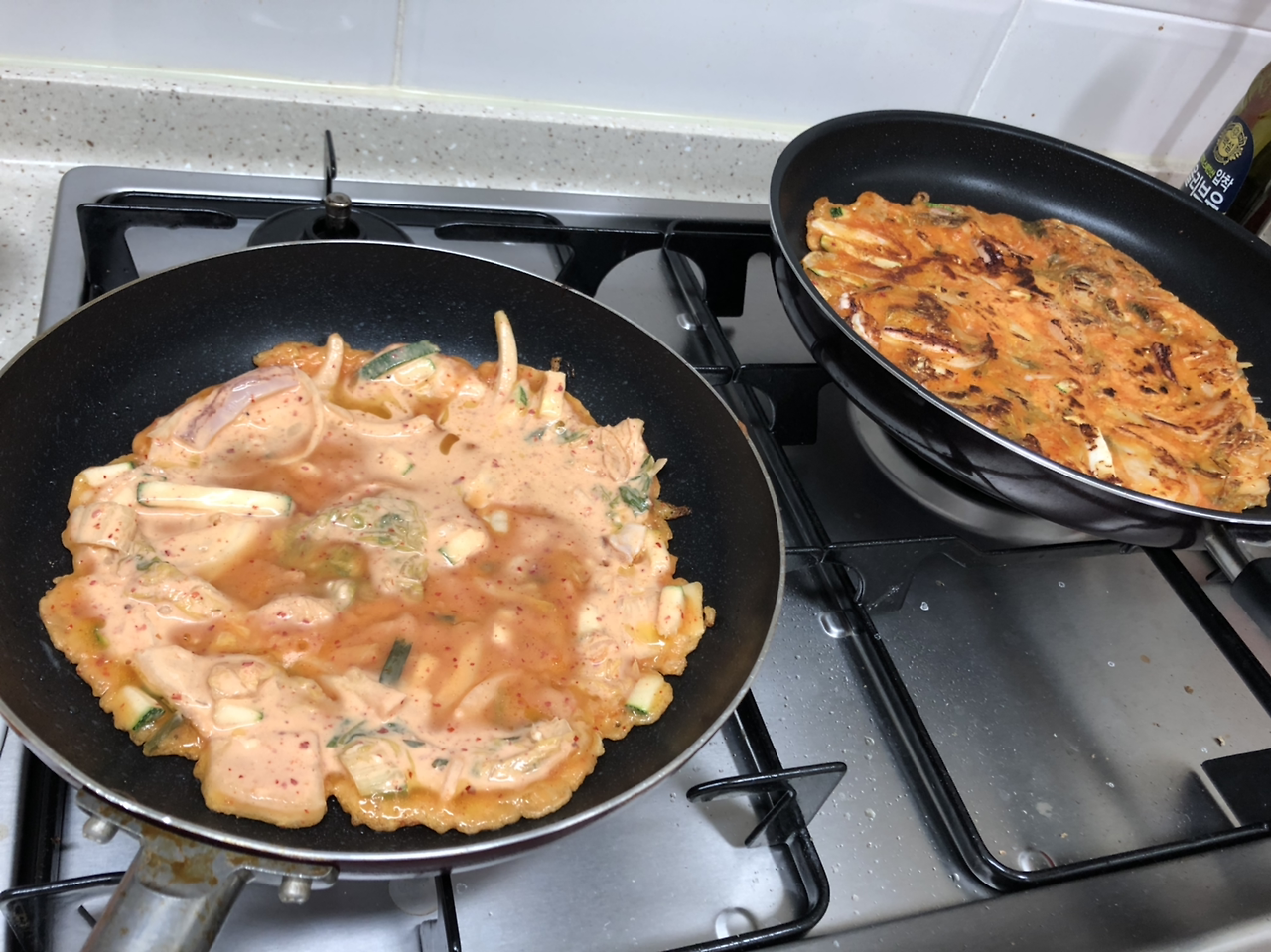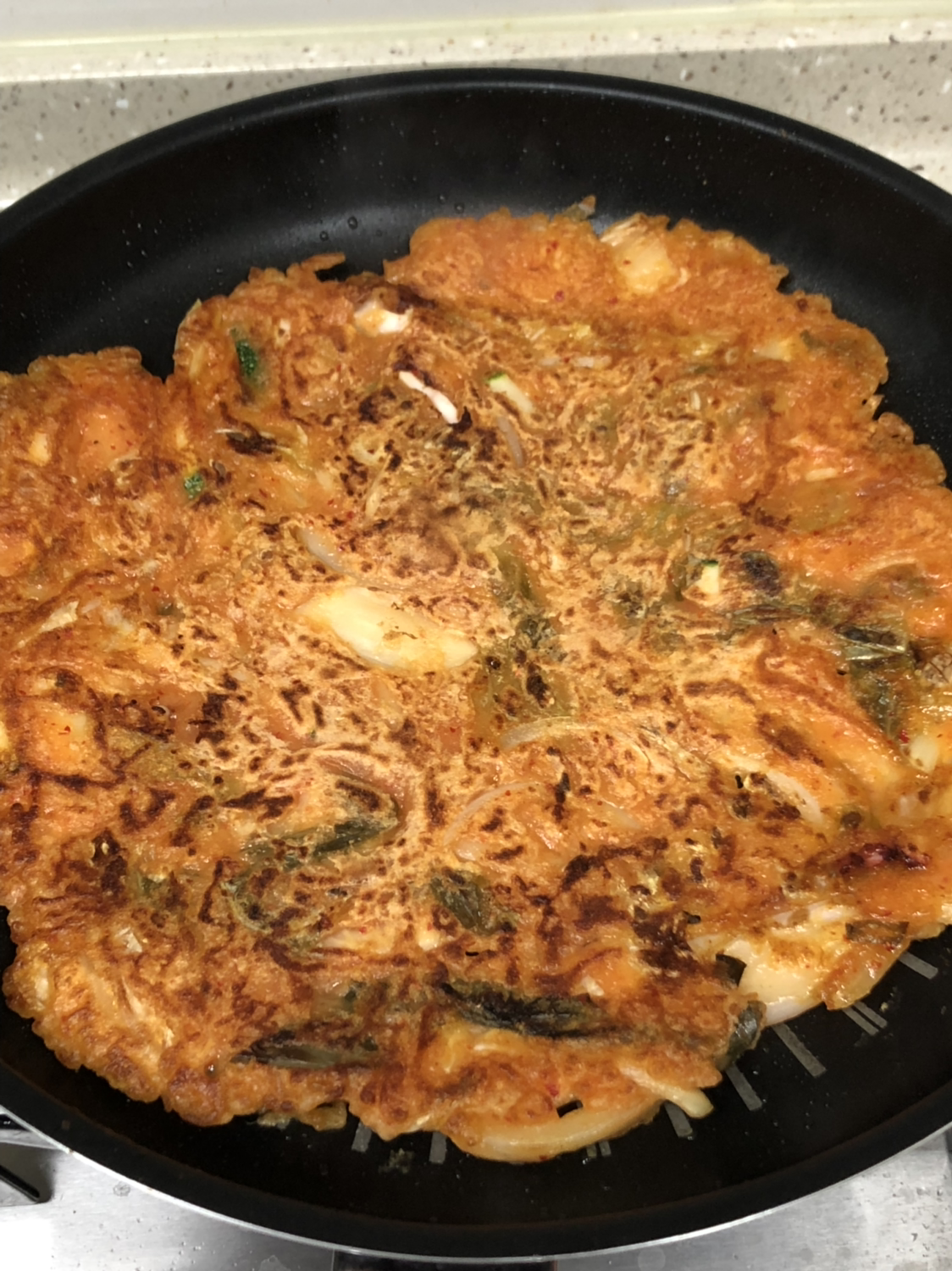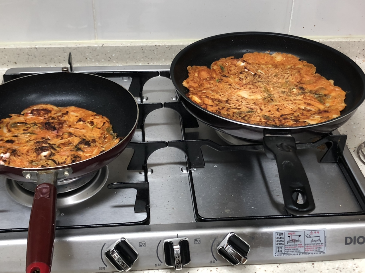아침 겸 점심으로 오징어 듬뿍 넣은 김치 부침개.