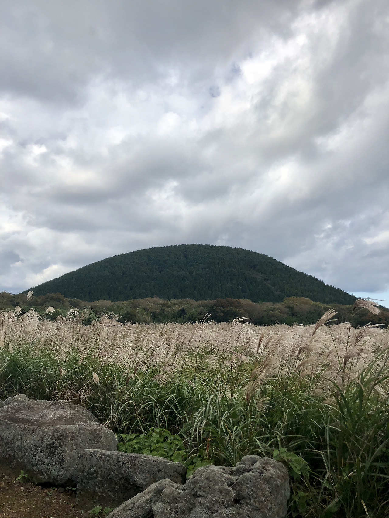 멀리 오름에서 보이는 침엽수의 아주 진한 초록.