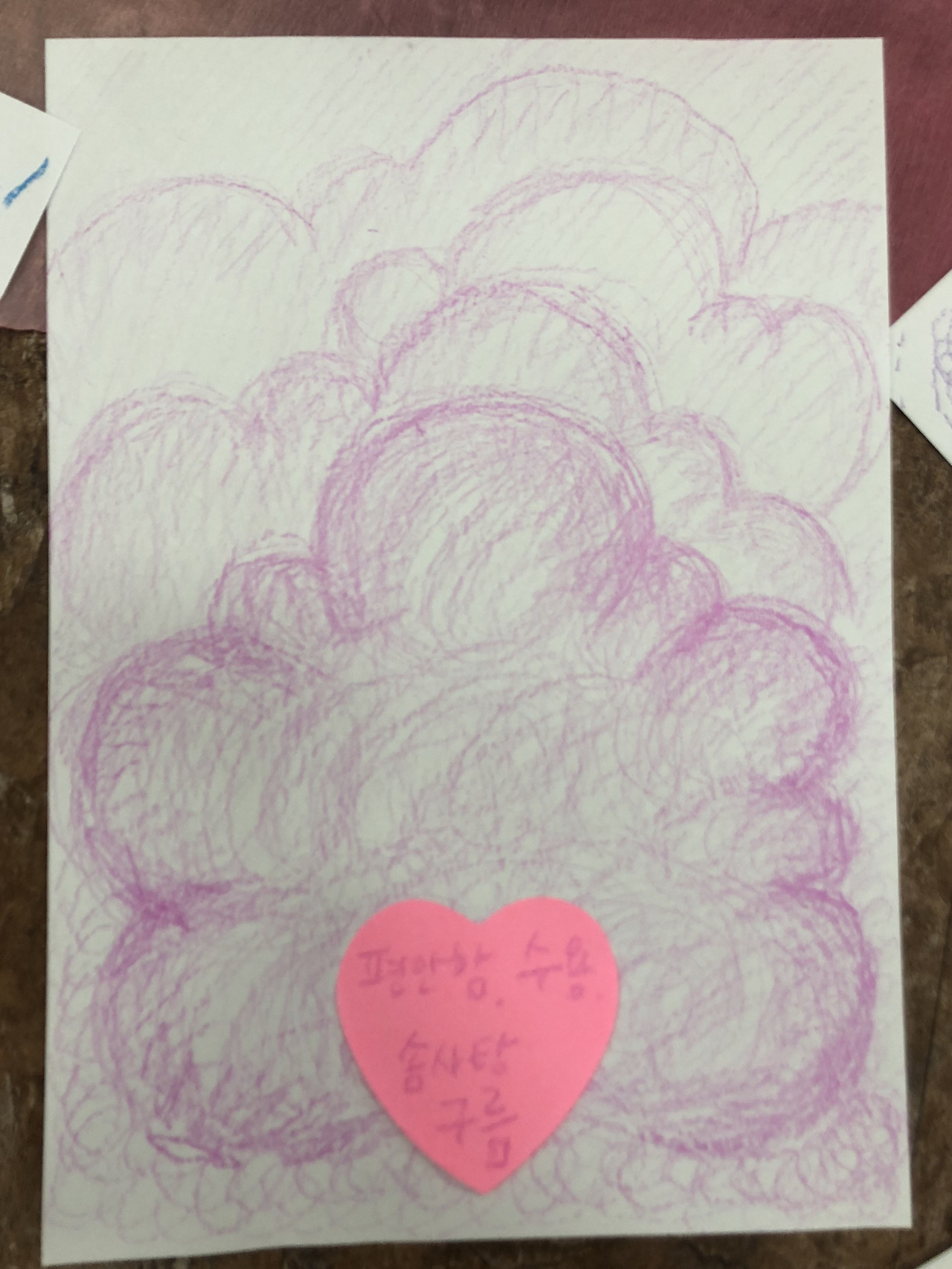 호흡이 쑥 내려가며 편안함과 수용의 욕구가 충족 되니 뛰어 들면 폭신하고 포근할 것 같은 여러겹의 핑크빛 솜사탕 같은 구름이 연상되었다.