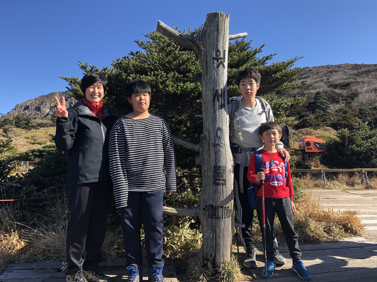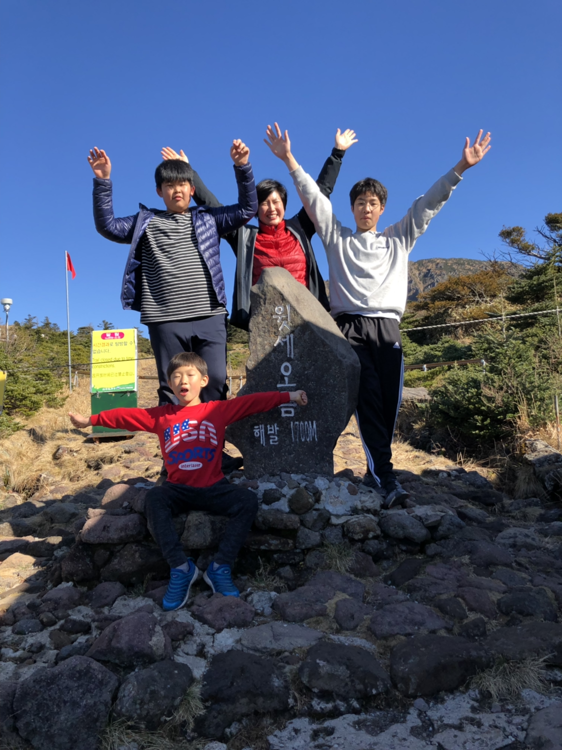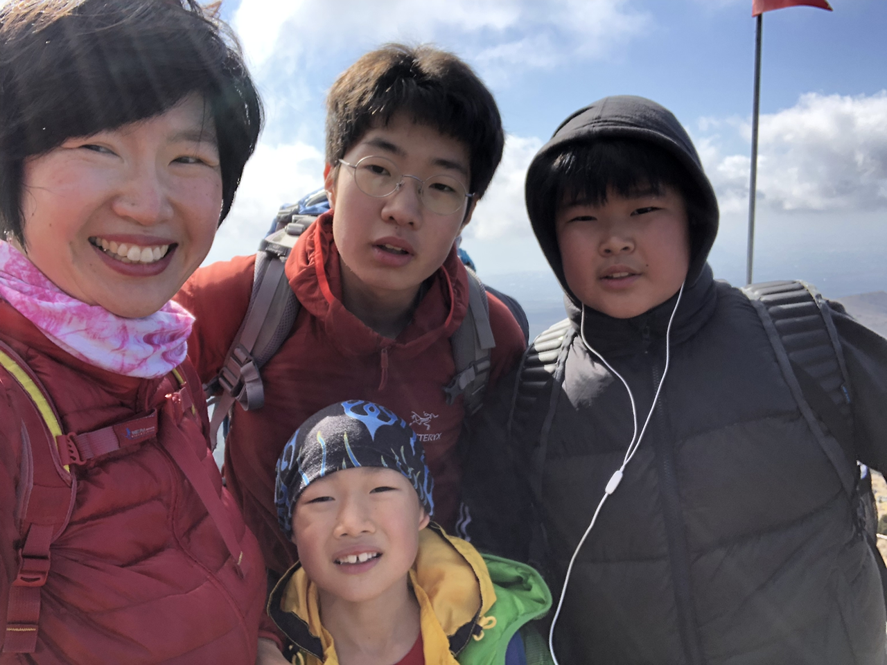 정상에서 함께 사진 찍은 후 큰 아들과 막내 아들은 먼저 가서 차에서 쉬겠다고 하산길을 재촉한다.