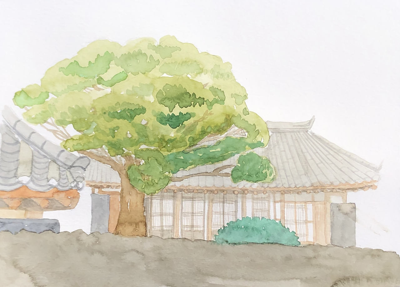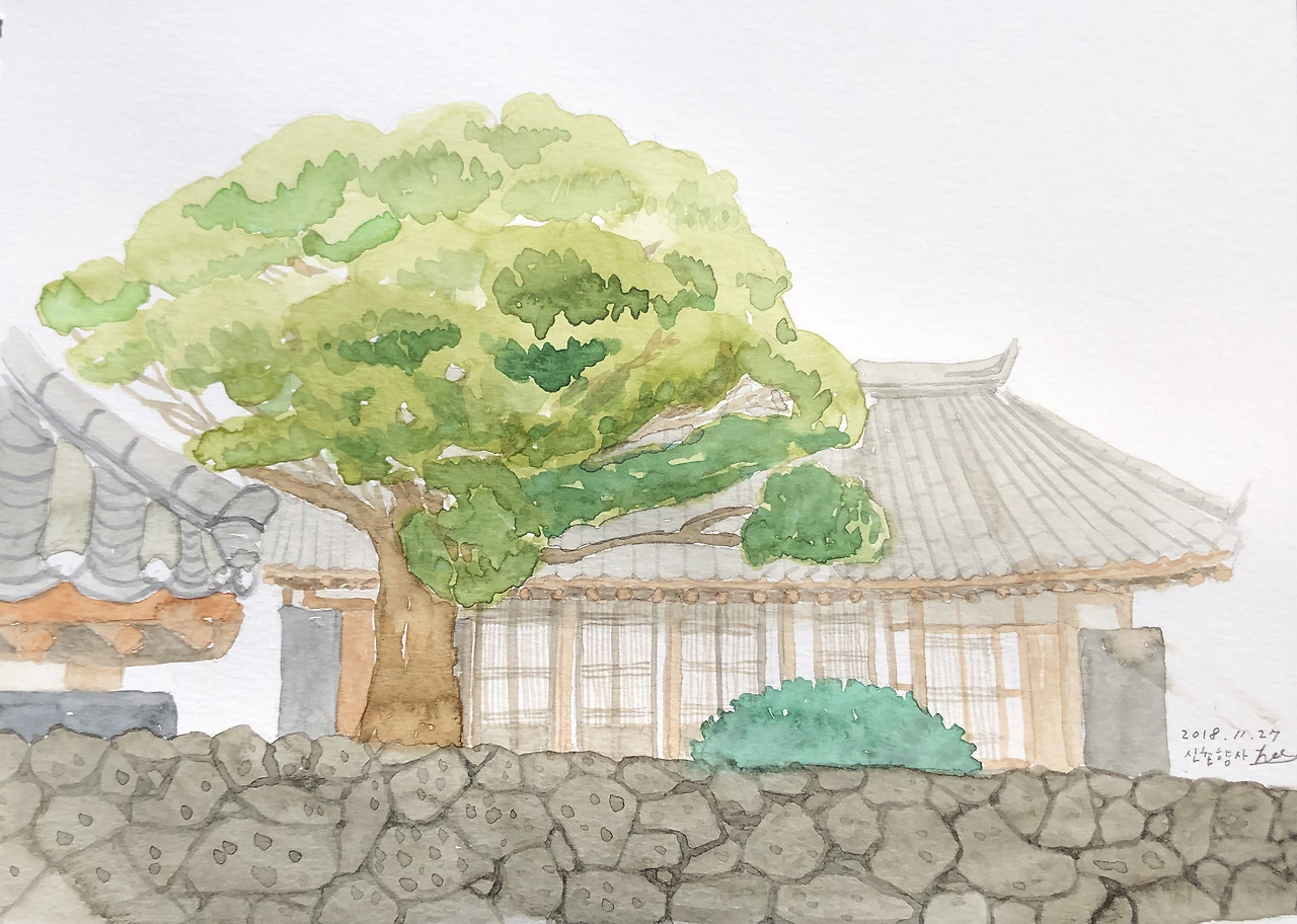 기와에 문짝, 돌담까지 그리다 보니 스케치도 두배, 채색도 두 배로 걸렸다.