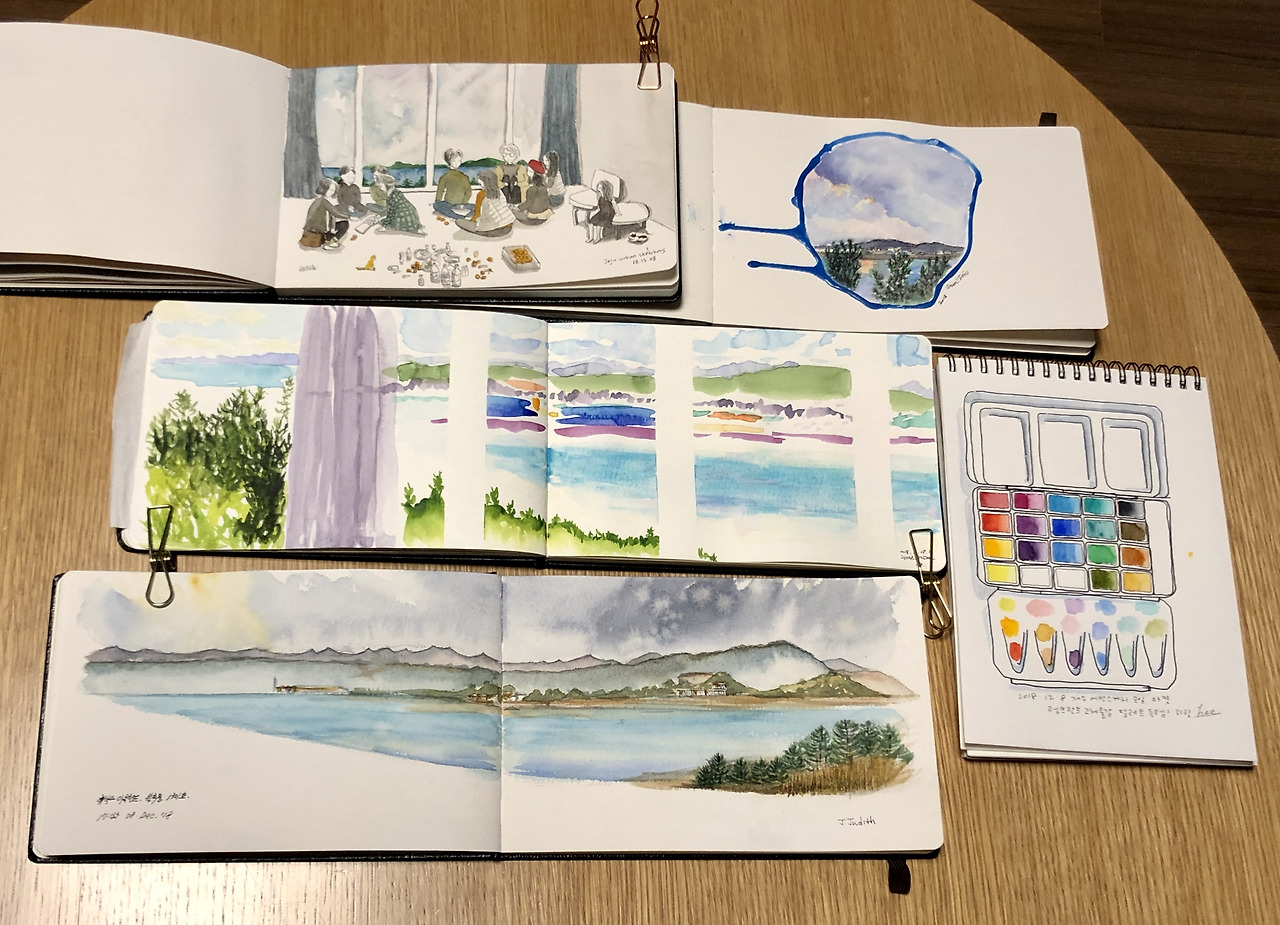 숙소 거실 창밖 풍경을 보며 어반 스케치하는