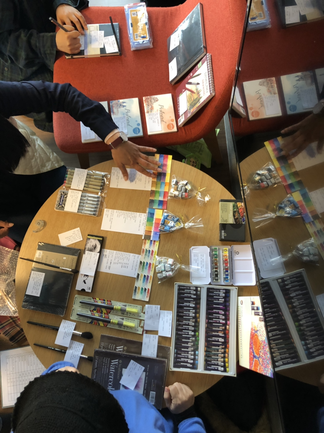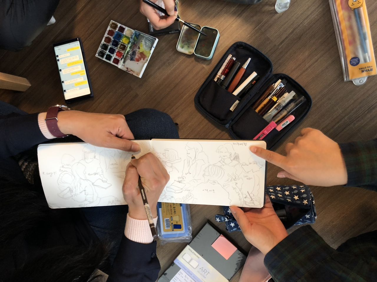 서로 드로잉 북과 그림 도구들을 구경하며 궁금한 것들을 물어본다.