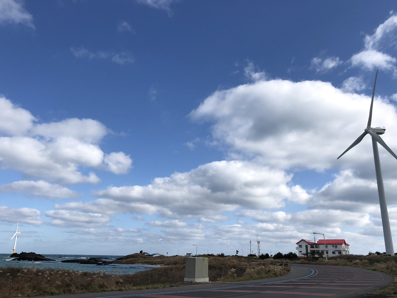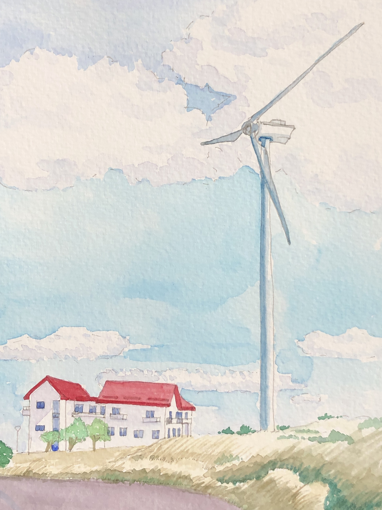 빨간 지붕집과 풍력 발전기가 인상적인 풍경.
