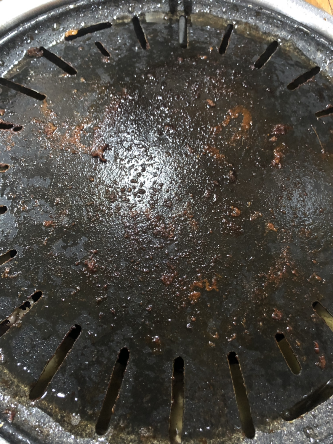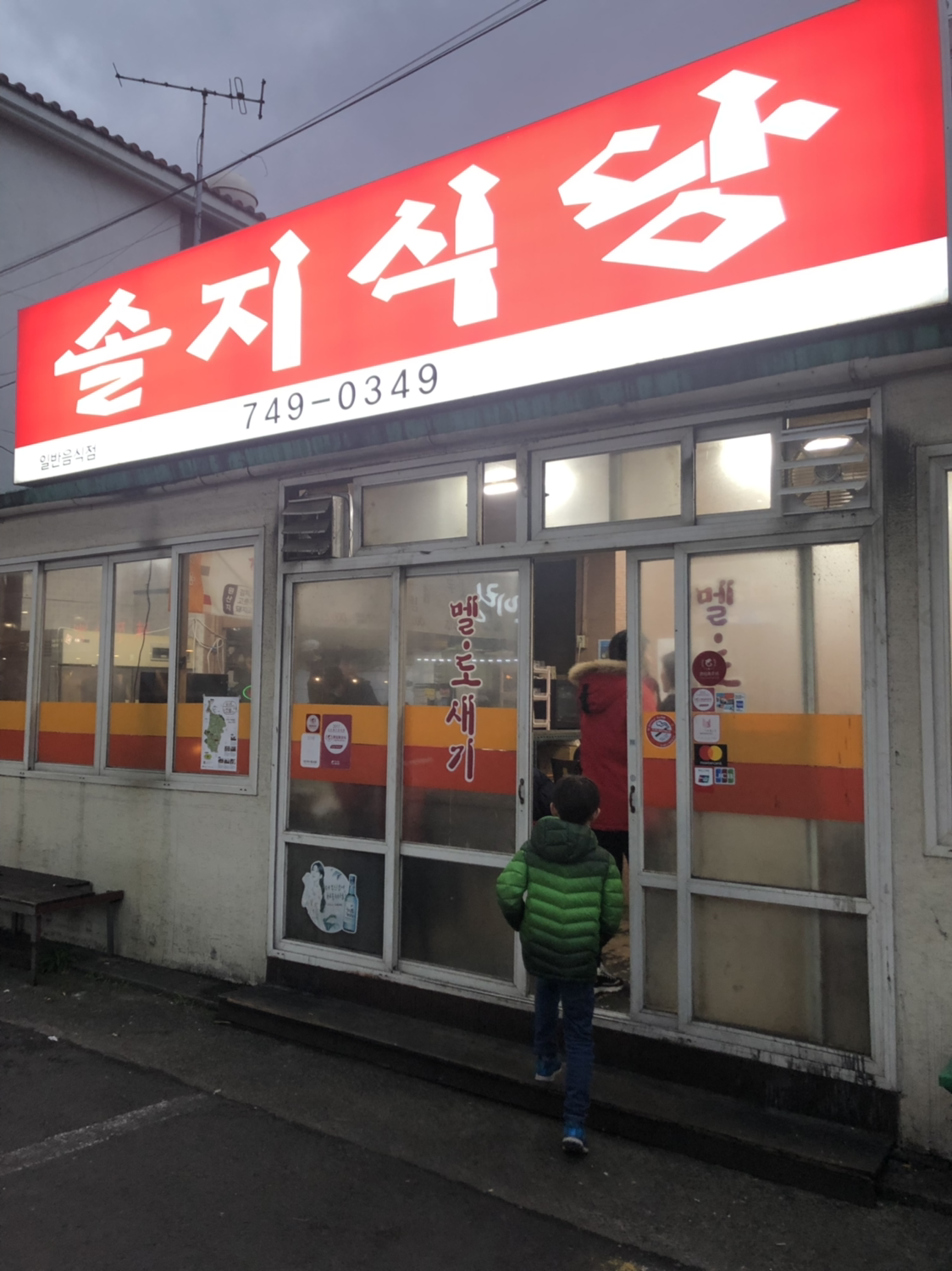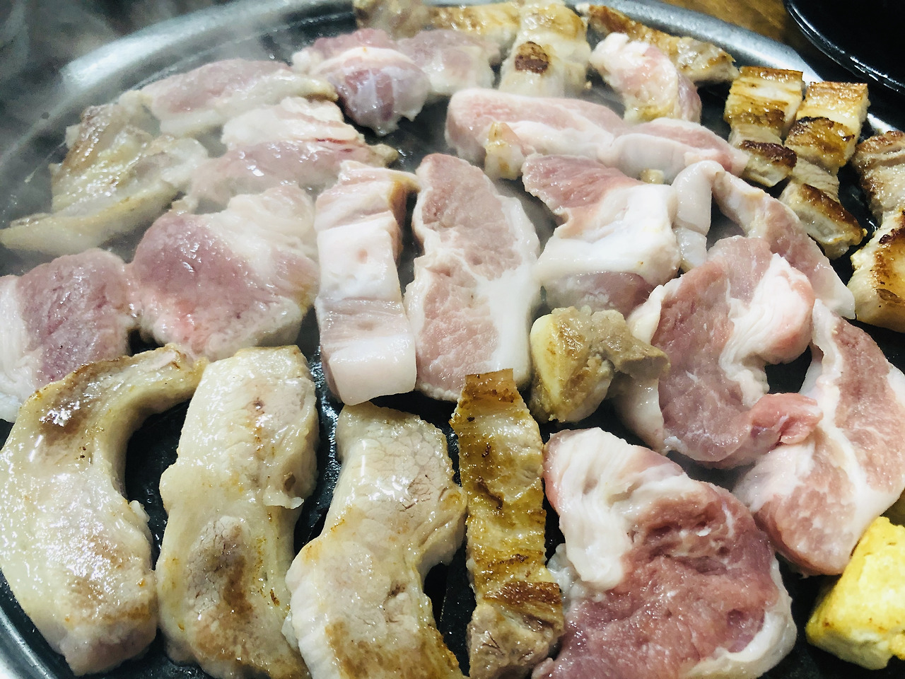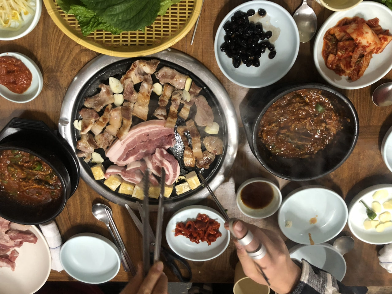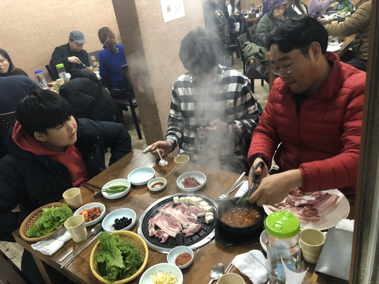 인공 숯불이 테이블마다 활활 타며 지글지글 고기를 굽는 솔지 식당. 고기는 기차게 맛있지만 공기는 나쁘다.