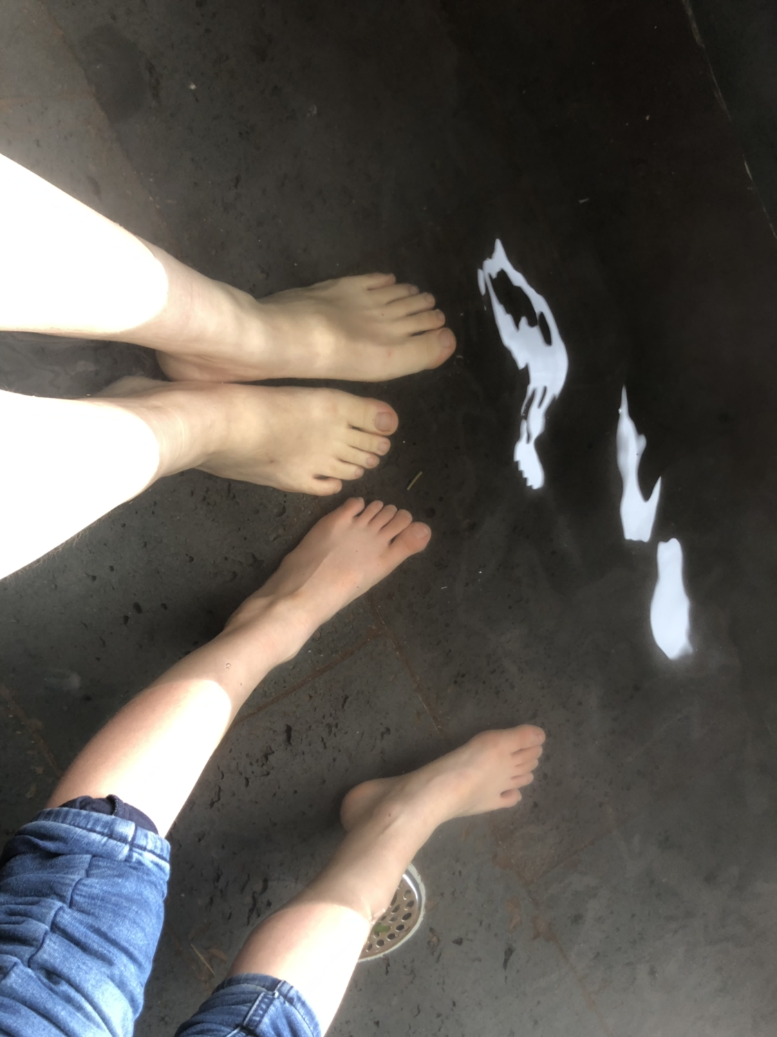 목욕 좋아하는 어린이들이 그냥 지나치지 않고 발을 담근다.