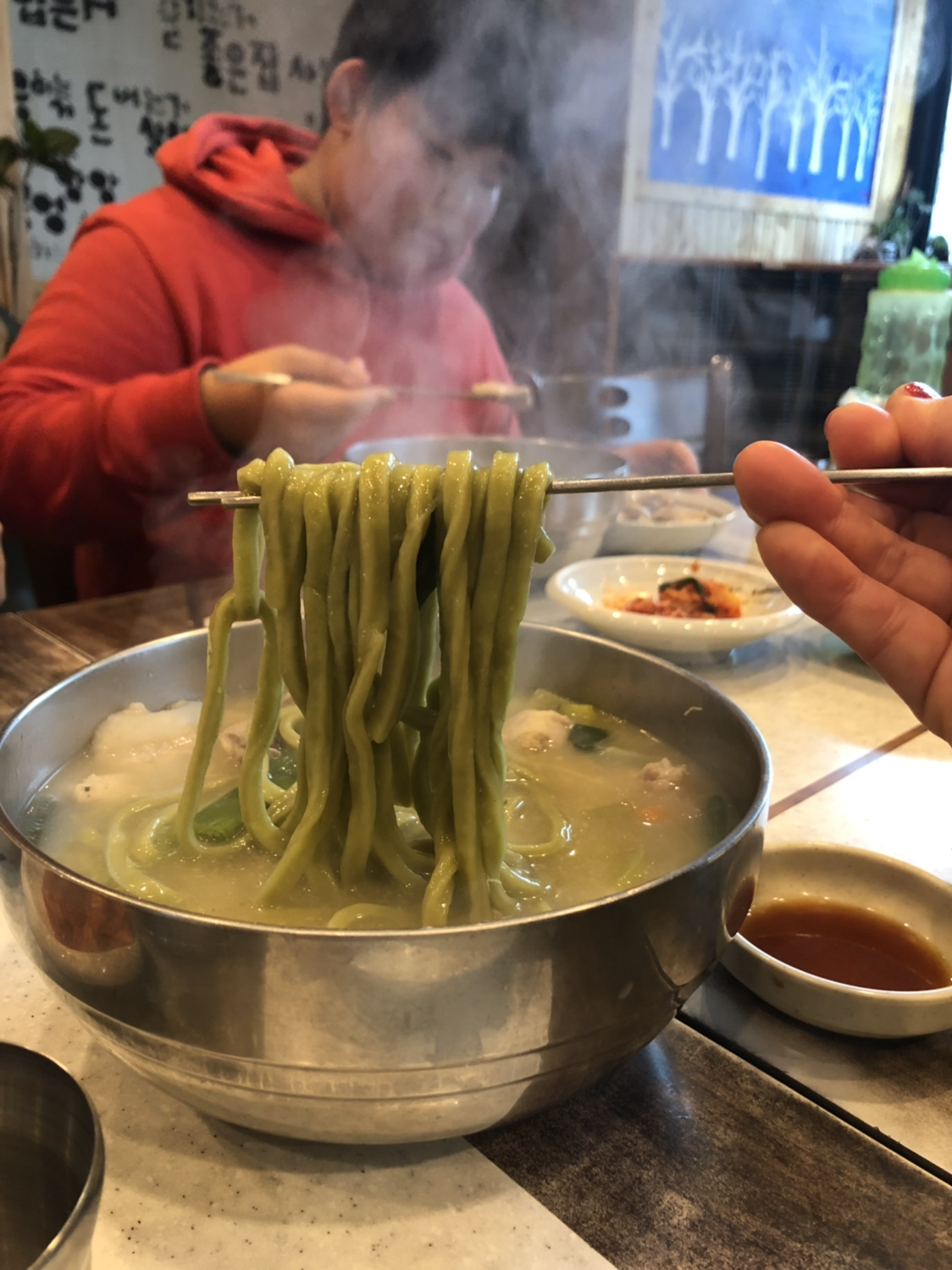 우리밀에 녹차를 넣은 면발이 쫄깃하다.